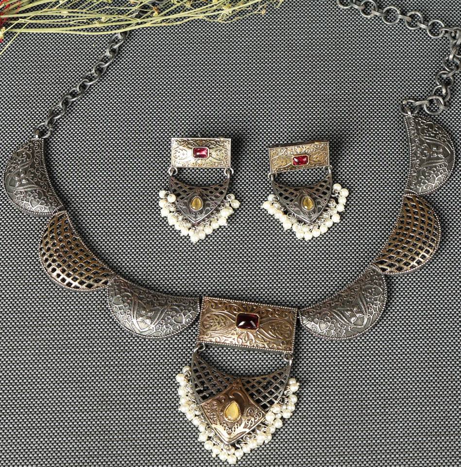 Ensemble de bijoux bohèmes en argent oxydé bicolore | Collier et boucles d'oreilles tribaux avec pierre rouge sertie en clos | Mariage ethnique indien et fiançailles