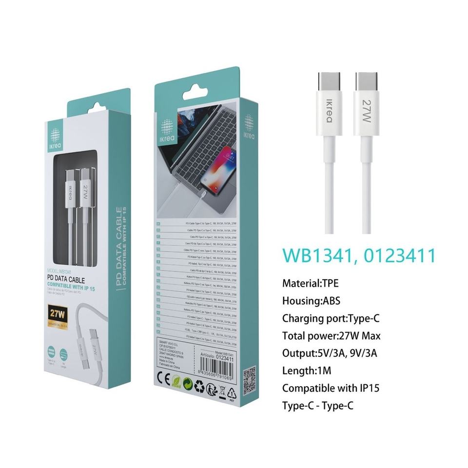 Câble Type C vers Type C 27W 1m Blanc pour iPhone 15 Series