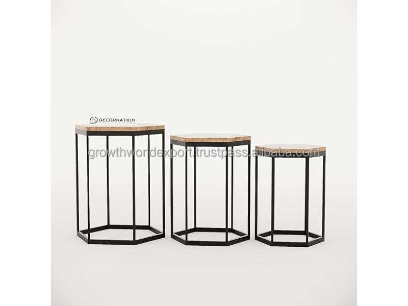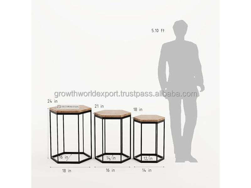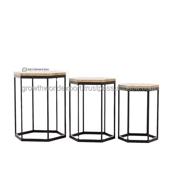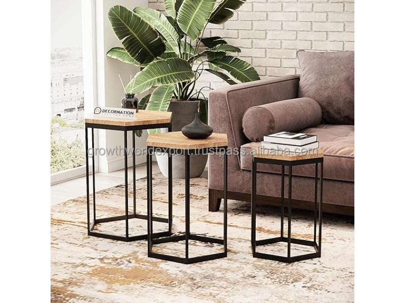 Ensemble de tables basses gigognes rondes modernes Tyria en bois de manguier avec pieds en métal, 3 niveaux, meubles de salon