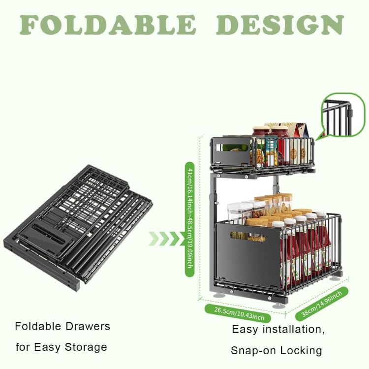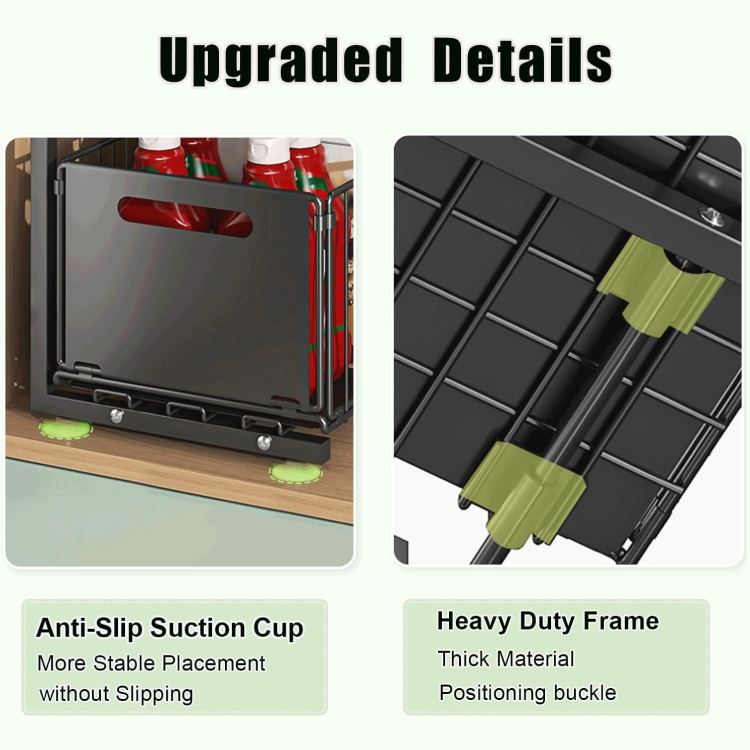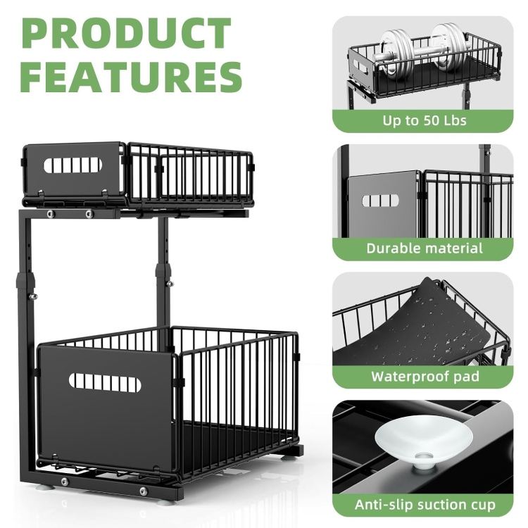 Description:Organisateur sous évier en métal en forme de L à 2 niveaux avec deux tiroirs coulissants