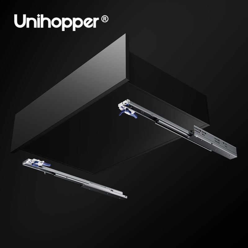 Glissières de tiroir cachées télescopiques à fermeture amortie à 3 voies UNIHOPPER, à ouverture par pression, à montage sous plan