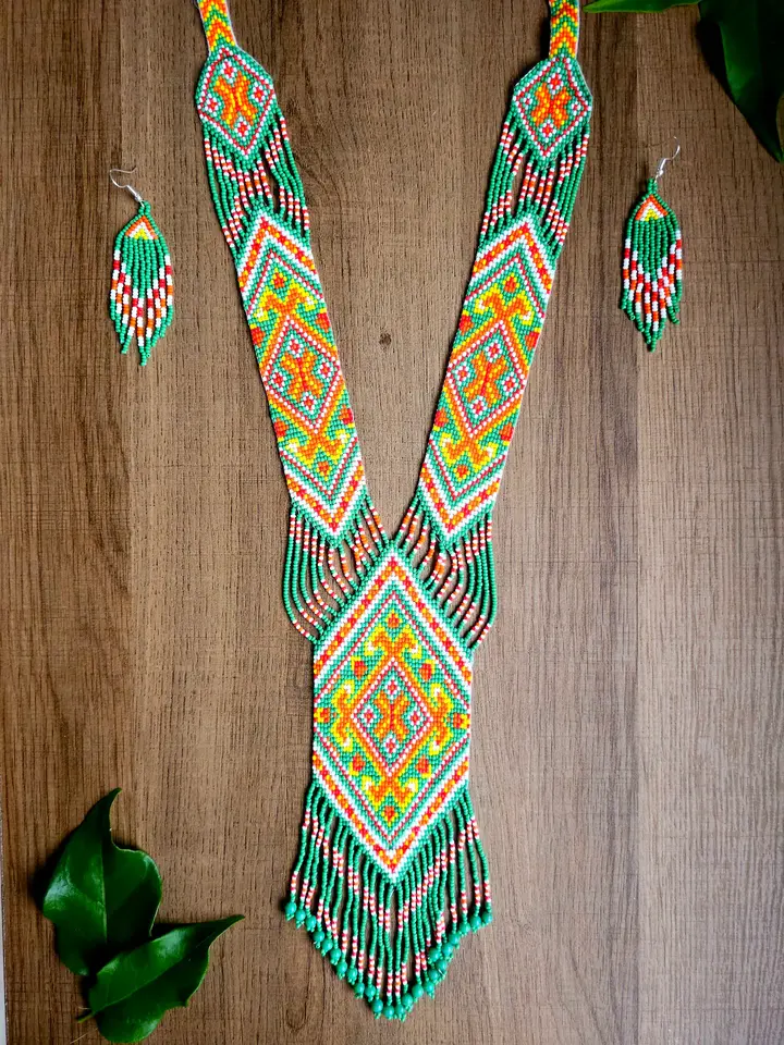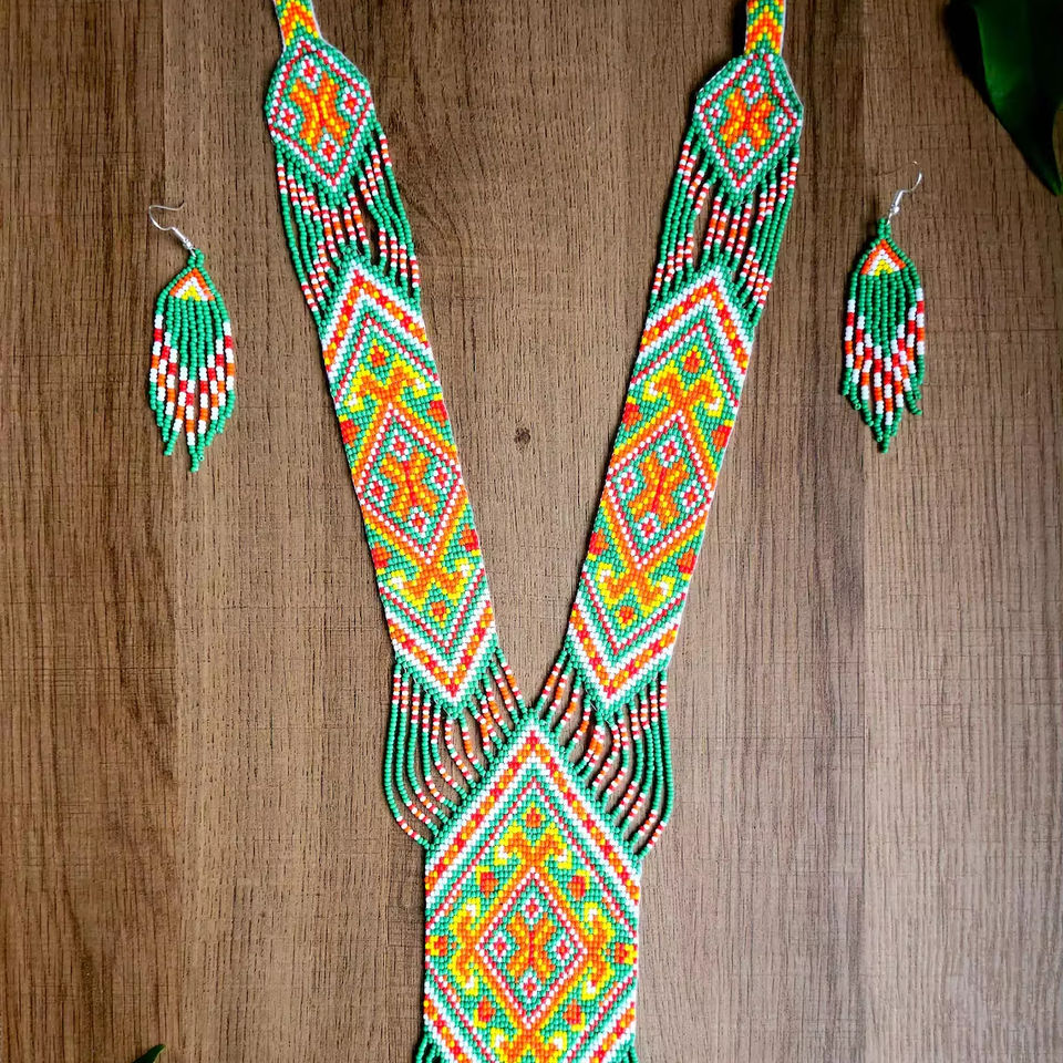 Ensemble collier et boucles d'oreilles faits main en perles de rocaille, style vintage unique : Ensemble Bohème Jardin Tropical avec boucles d'oreilles, idéal pour offrir, Noël