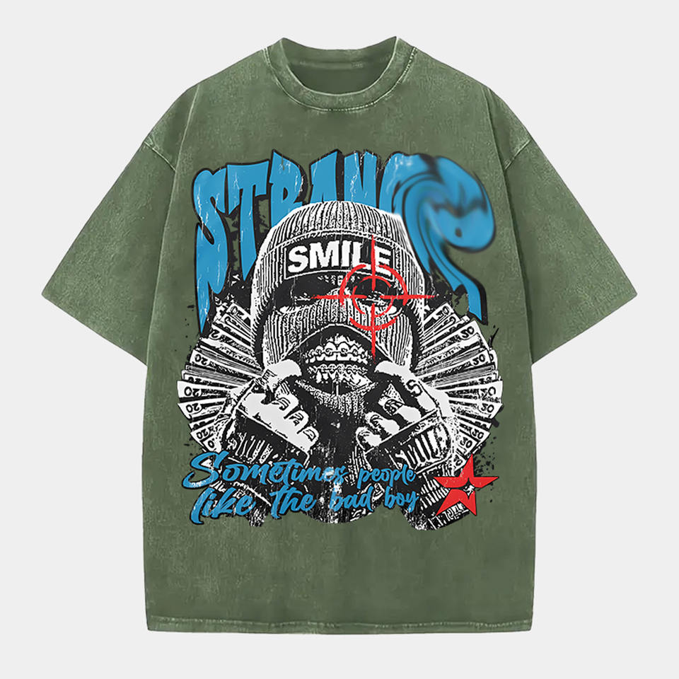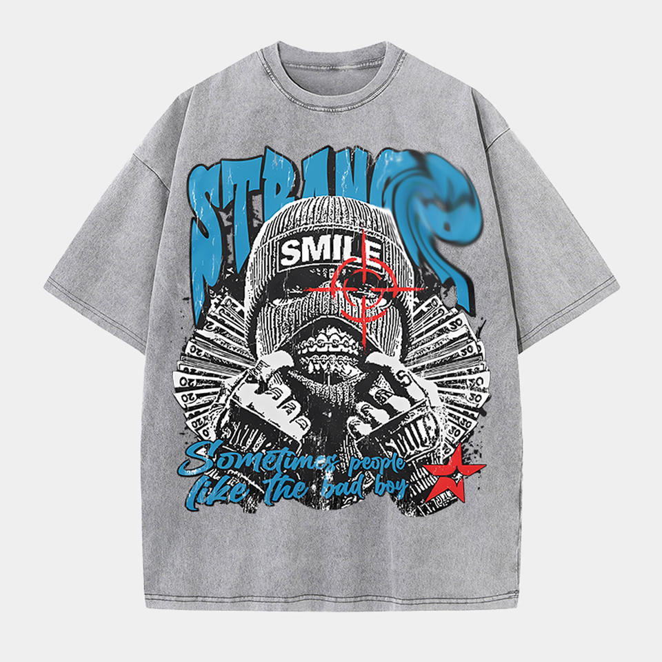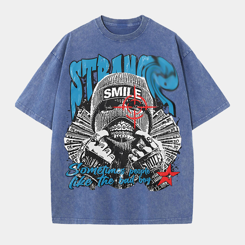 Entrepôt local américain : T-shirt graphique lavé « Strang Smile Sometime People Like the Bad Boy » multicolores, design personnalisable