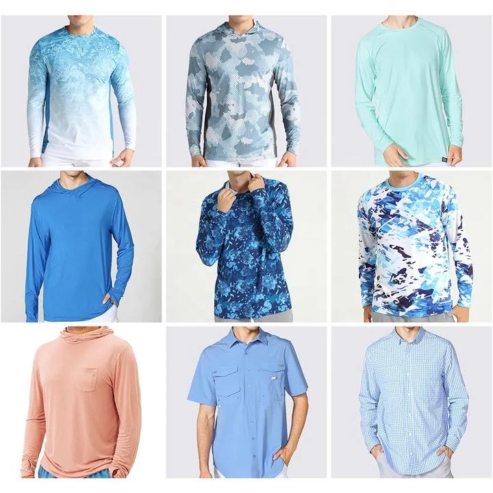Chemise de pêche en polyester spandex imprimée pour homme taille US personnalisée chemise à manches longues Upf50 Performance chemise de travail en plein air avec capuche