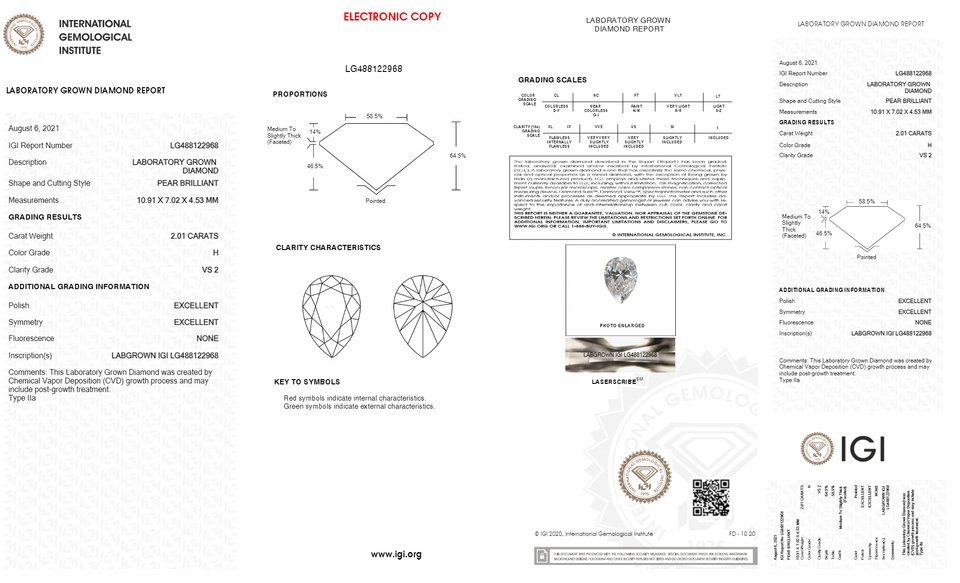 Stock USA Meilleur prix garanti Diamant cultivé en laboratoire certifié IGI Diamant poire brillant 2.01 H VS2 CVD Diamant polonais