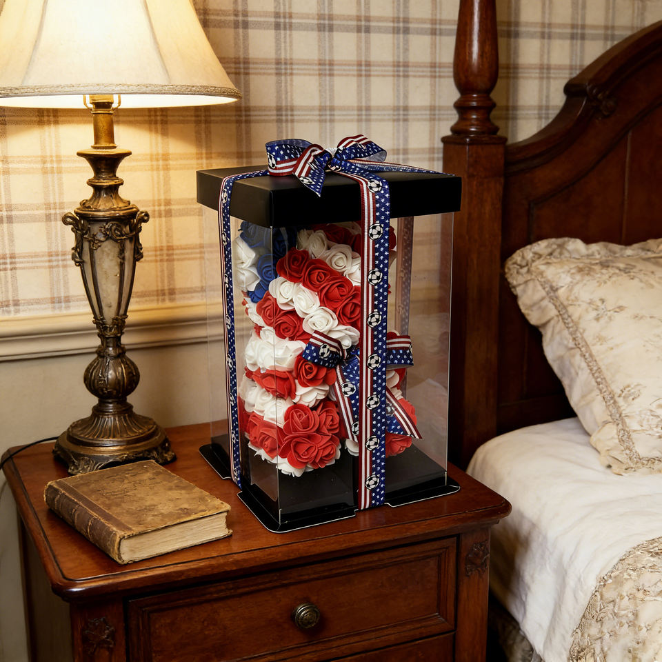 Boîte de roses artificielles sur le thème des États-Unis, roses rouges, blanches et bleues avec ruban de football pour les fans de football américain, vente en gros