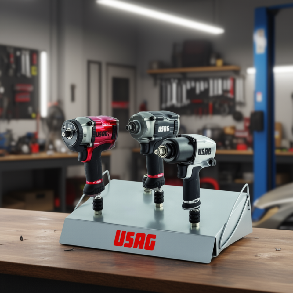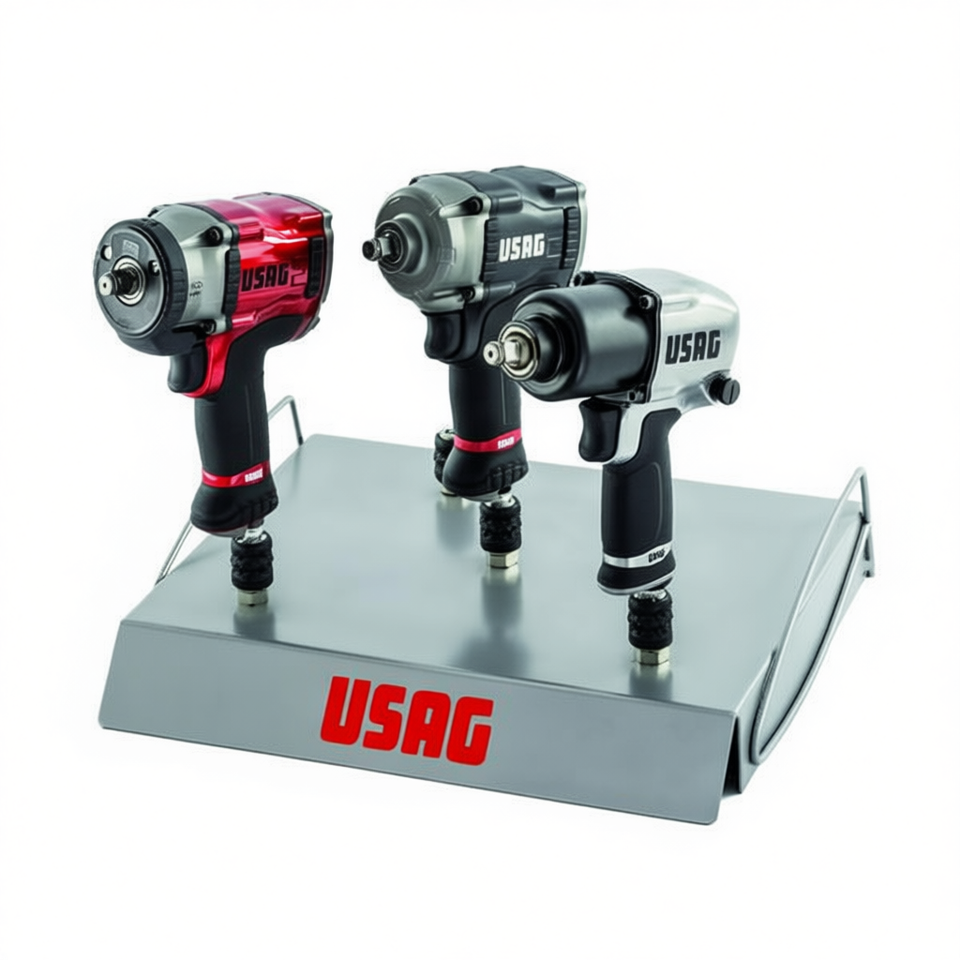 Présentoir de comptoir USAG avec 3 clés à chocs pneumatiques pour un accès pratique