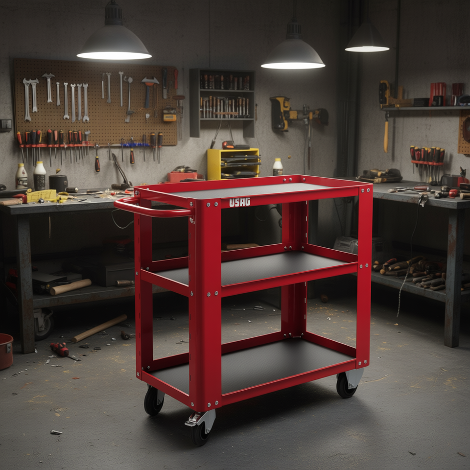 Chariot à outils USAG à 3 étagères, rouge, en acier, avec plan de travail roulant et organisateur de rangement