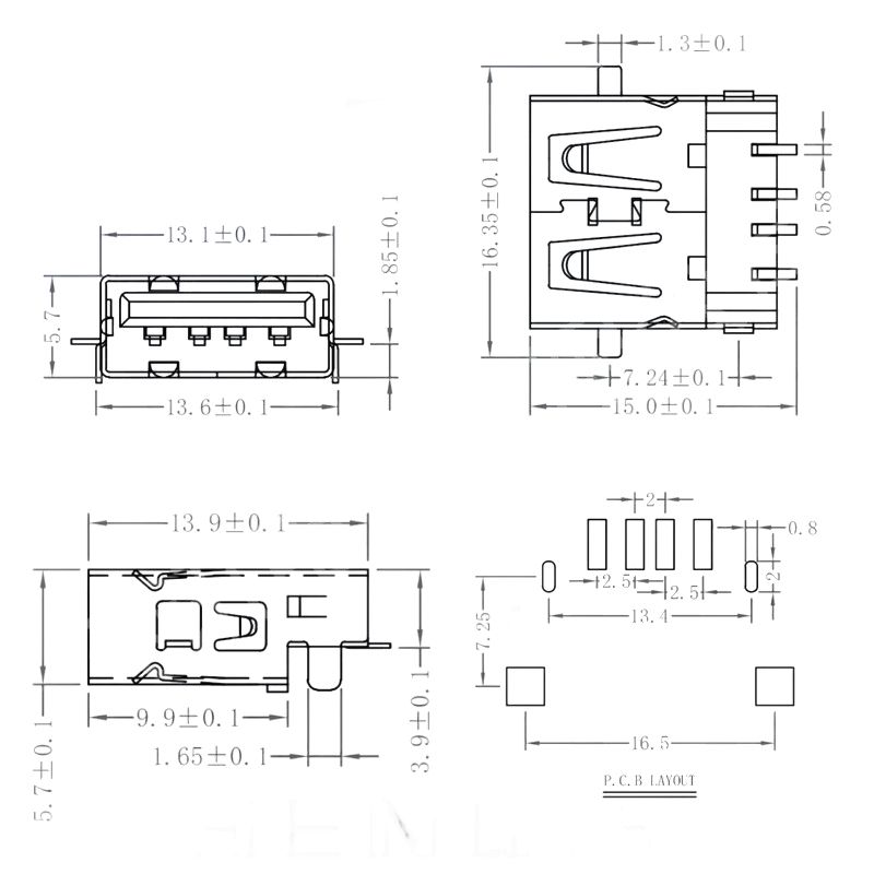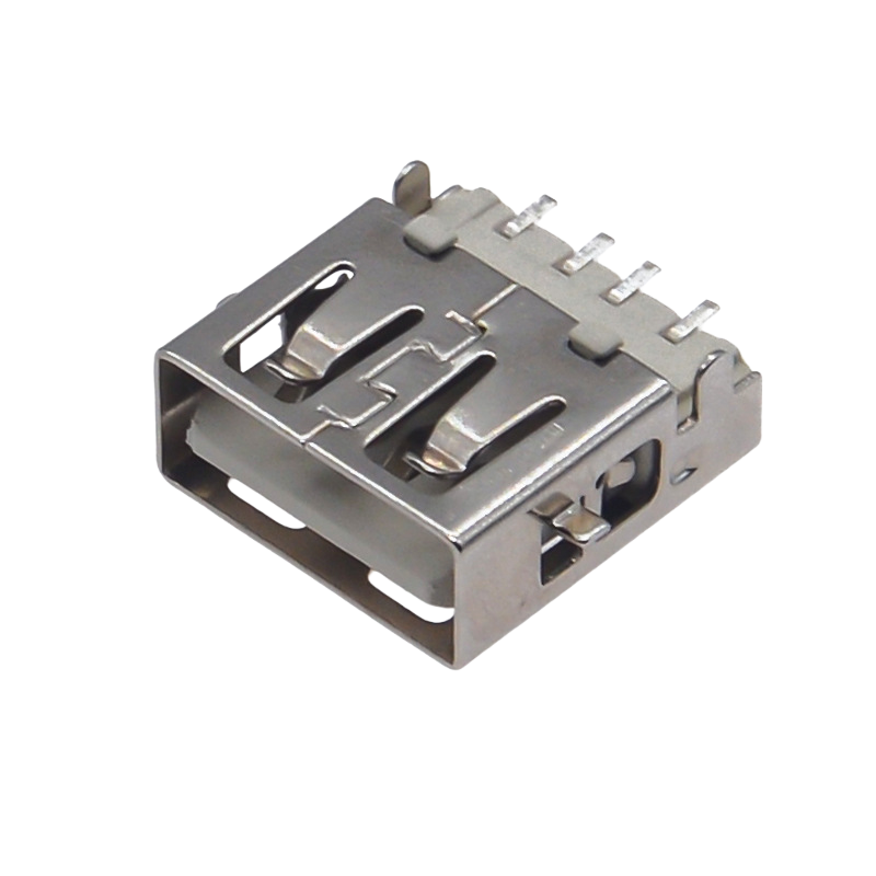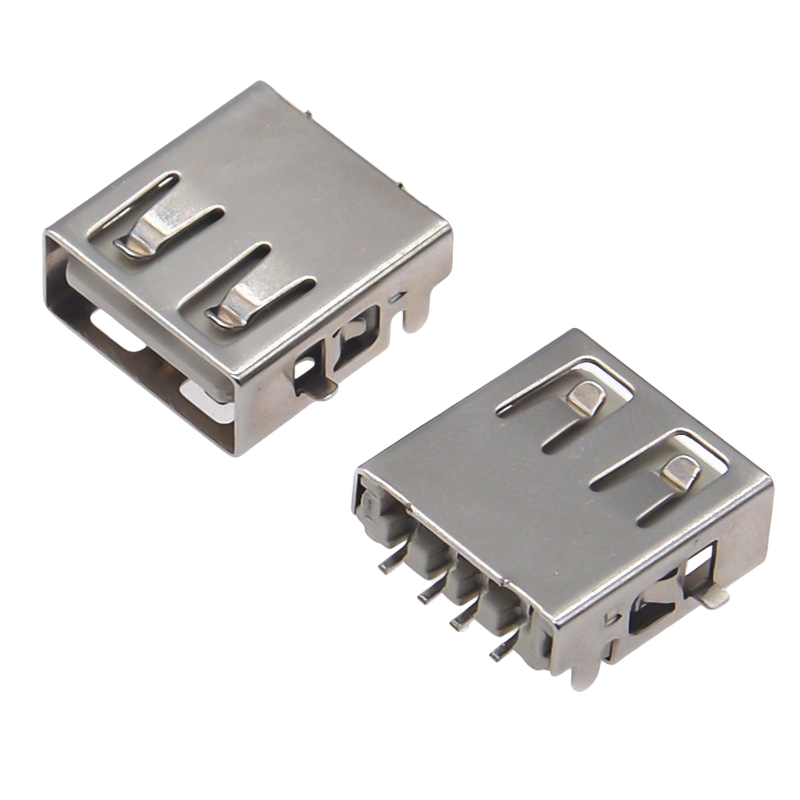 Connecteur USB 2.0 Type-A Femelle à Angle Droit, Montage SMT Encastré à Profil Bas Sans Bride, 4 Broches avec Ailettes de Fixation