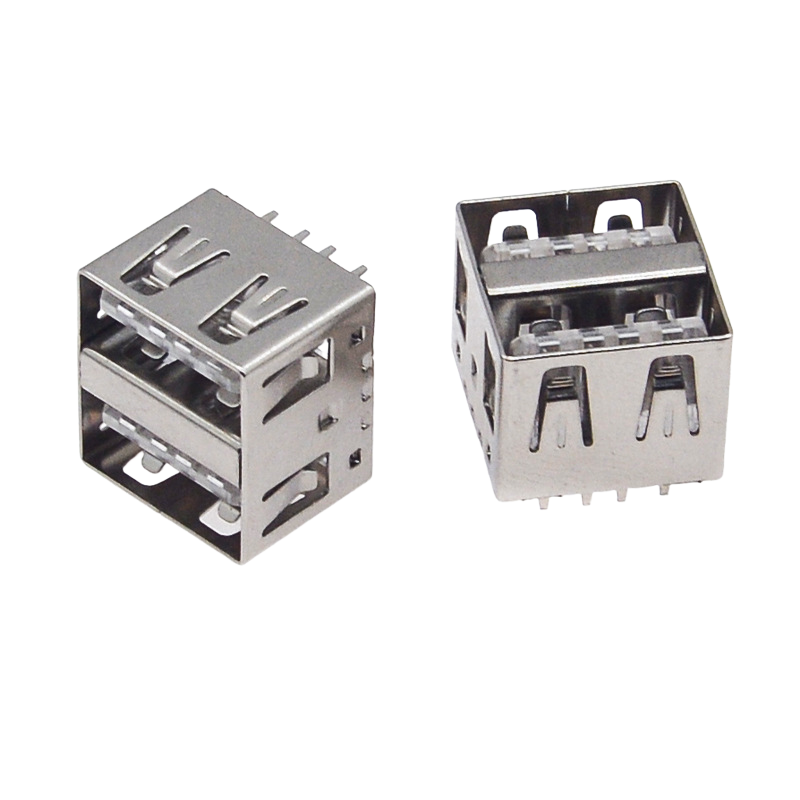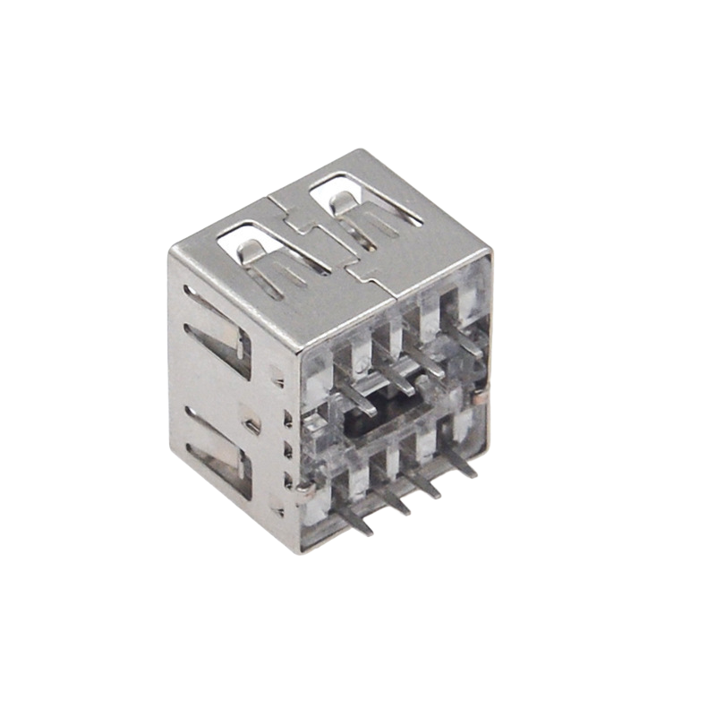 Prise USB 2.0 Type-A femelle, montage vertical double-étage à travers trou, corps court sans rebord, isolateur transparent