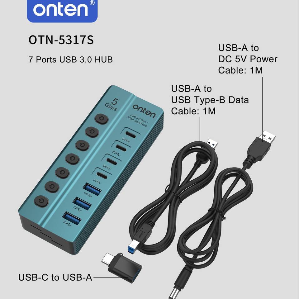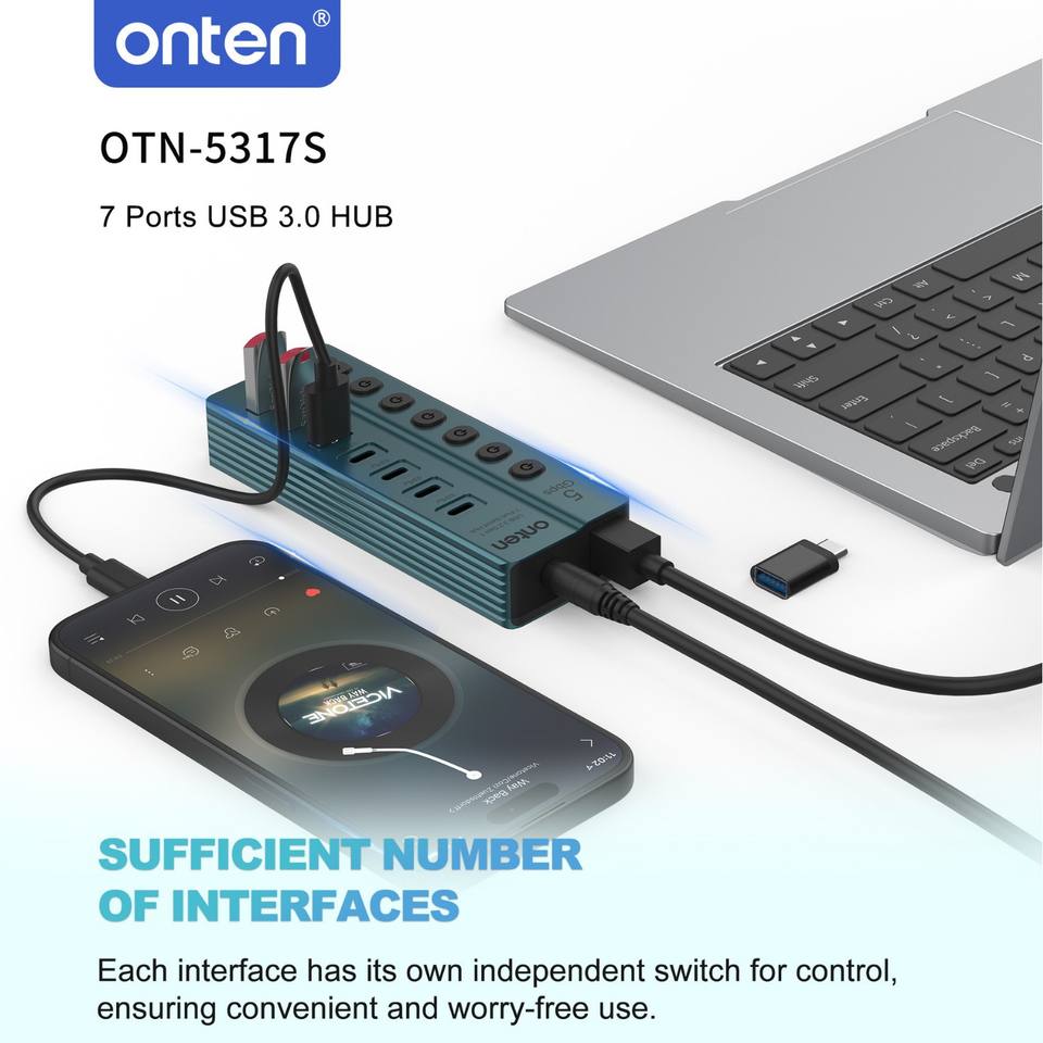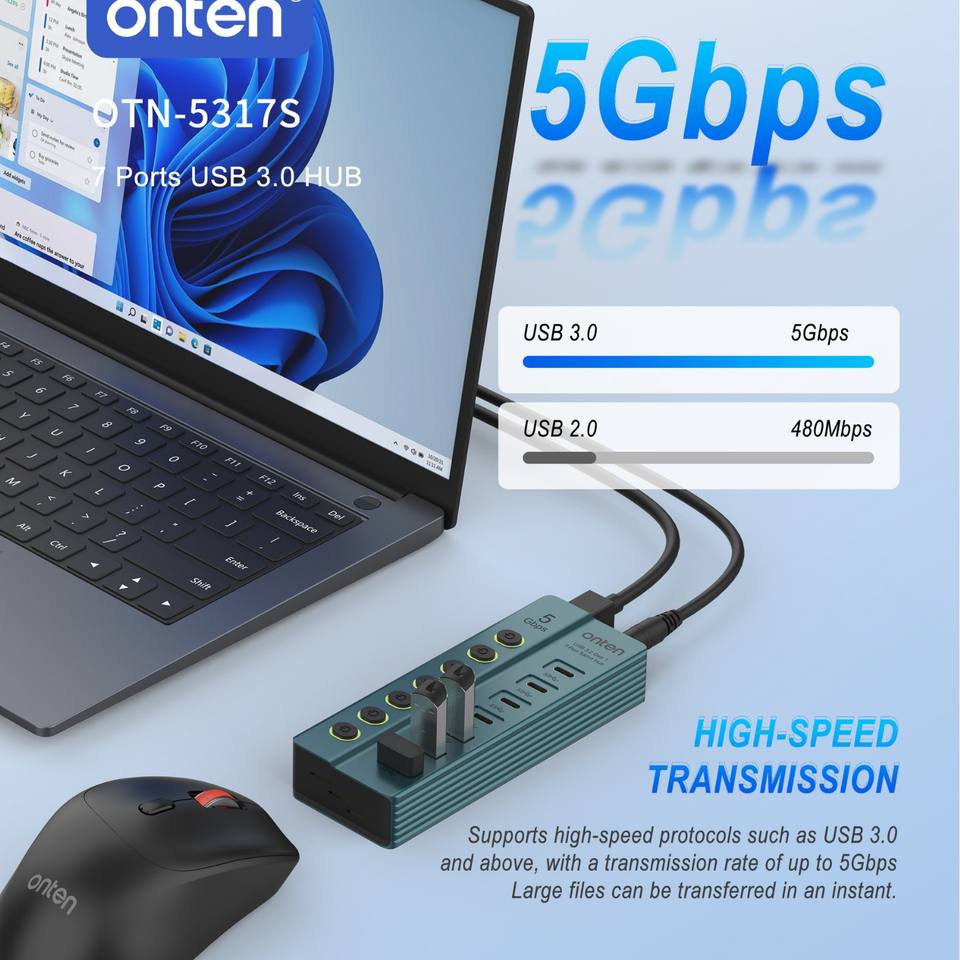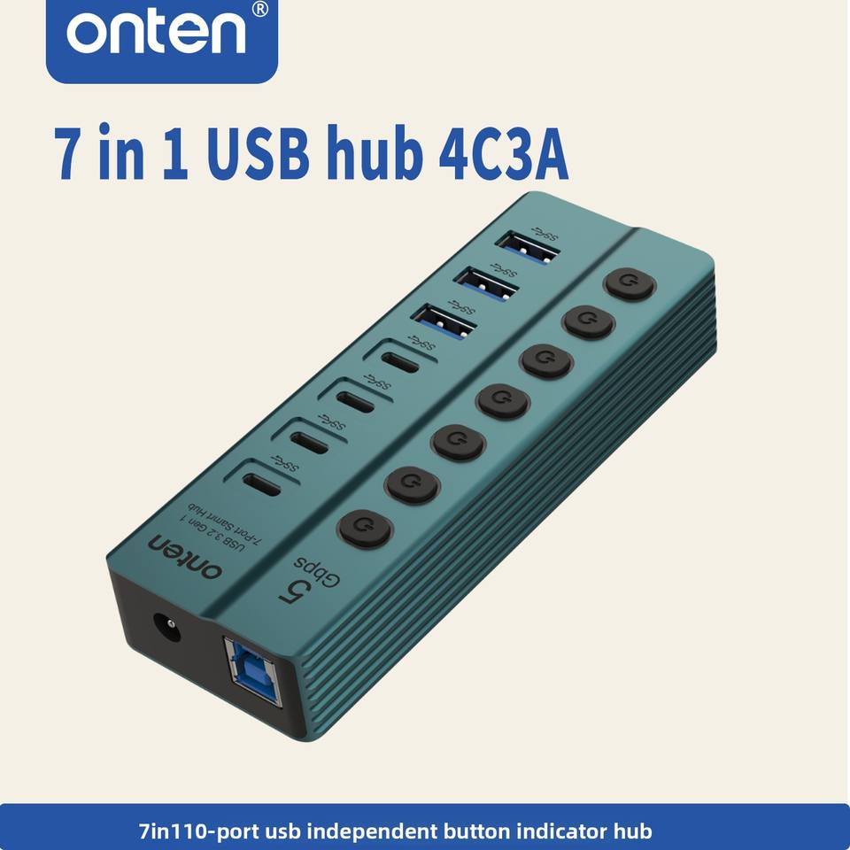 Hub USB 3.0 à 7 ports USB-A USB3.2 Gen1*3 Adaptateur 5 Gbps avec interrupteur indépendant et indicateur en alliage d'aluminium