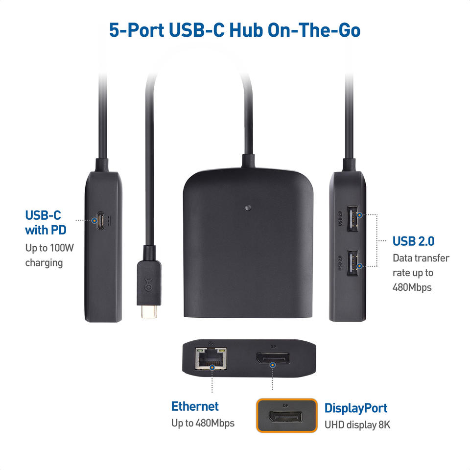 Hub USB C 8K DisplayPort 2x USB-A 480Mbps Ethernet RJ45 Port PD100W Chargement 5-en-1 Hub USB Type C