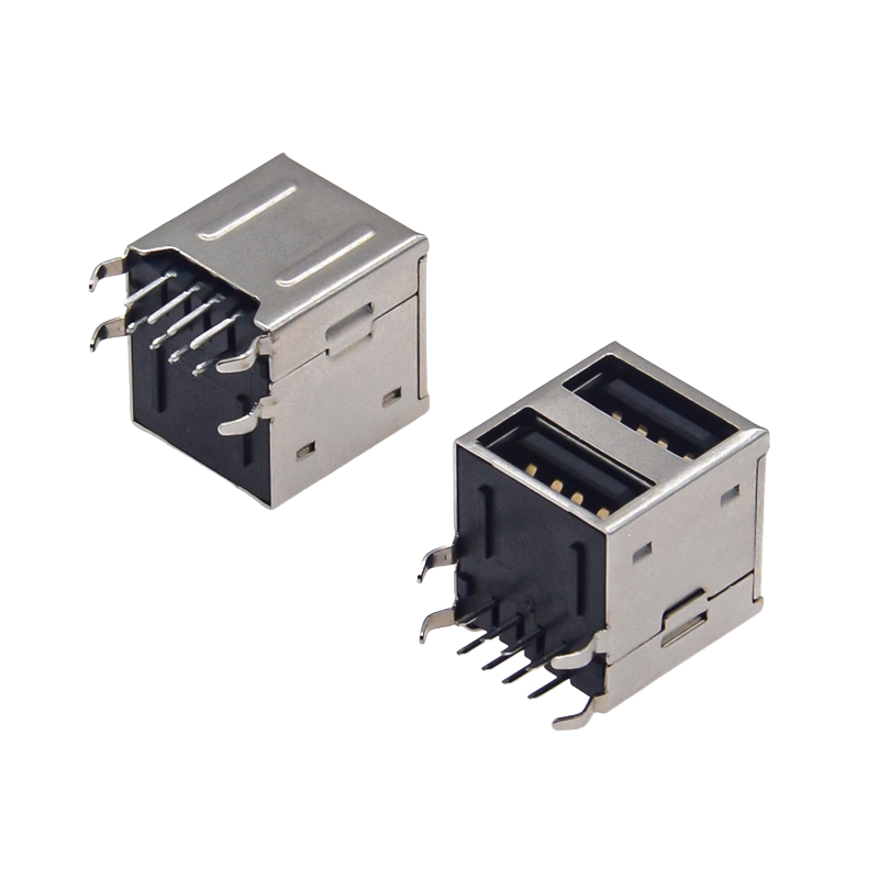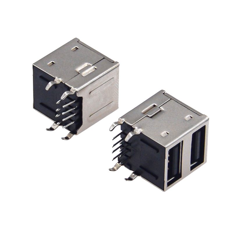 Prise USB Type-A femelle à double port, angle droit, 90° ° Conception blindée avec broches DIP à angle droit pour montage sur circuit imprimé