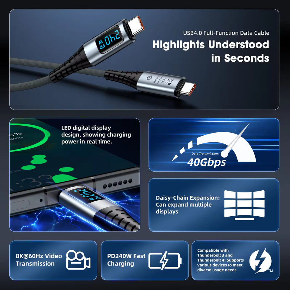 Câble de charge rapide USB4 LED Display PD3.1 240W 40 Gbps 8K60Hz pour Switch MacBook