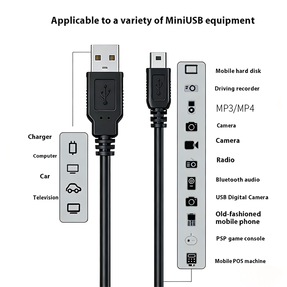 Câble de synchronisation et de charge USB-A vers Mini 5P, 1m, conducteur en cuivre pur 28AWG, gaine en PVC, pour appareil photo, terminal de point de vente, appareil industriel