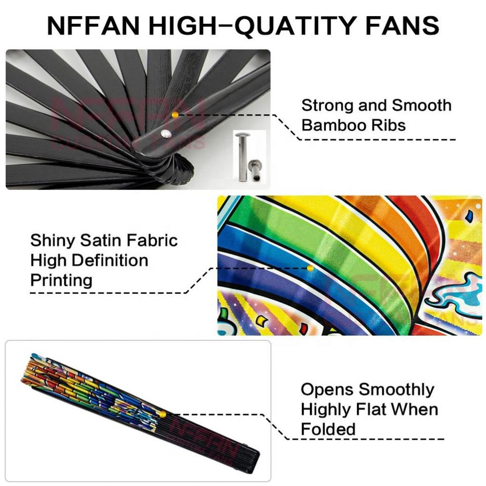 Ventilateur à main pliant en bambou imprimé personnalisé réactif aux UV Grands ventilateurs Rave Clack pour les festivals EDM Vente en gros
