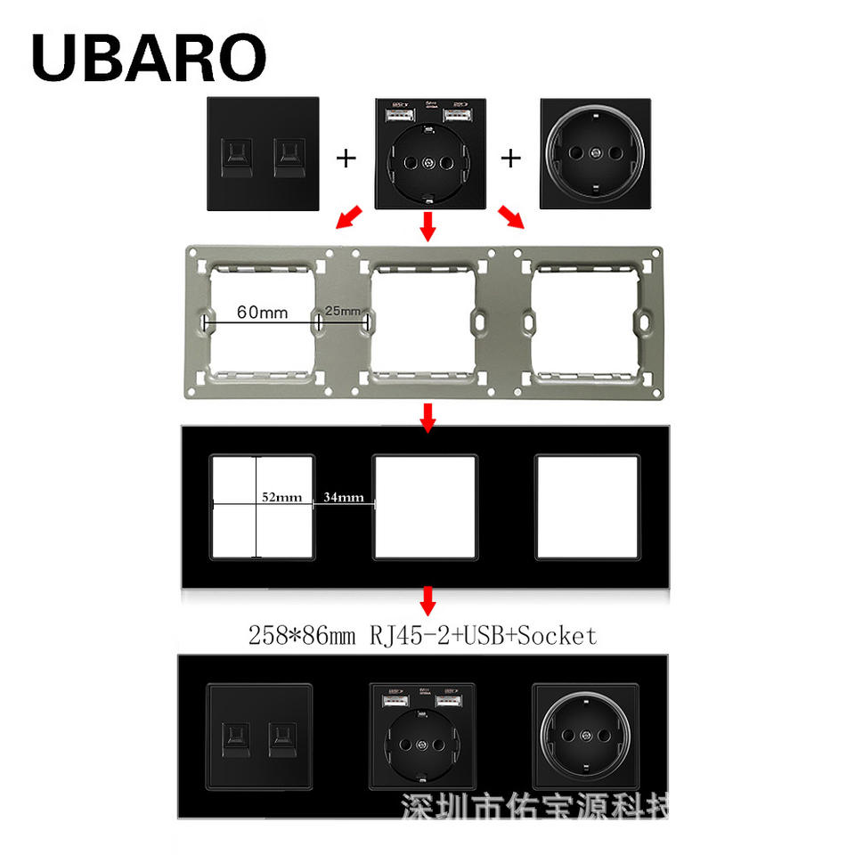Prise murale Ubaro 258x86mm avec ports RJ45 et USB, panneau modulaire pour la maison et le bureau