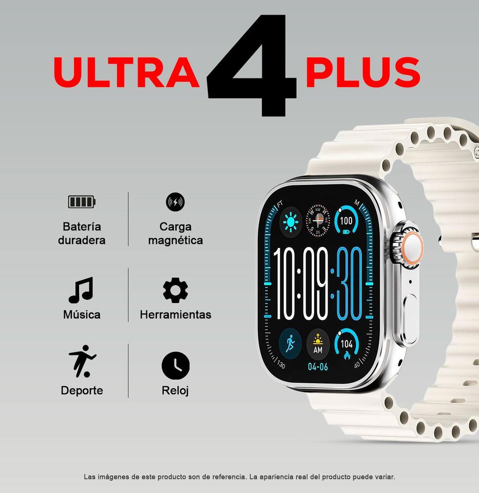 Montre connectée Android Ultra 4 Plus, écran AMOLED, longue autonomie, chargeur magnétique, résistance à l'eau 10 bars, sport et fitness, blanc et noir