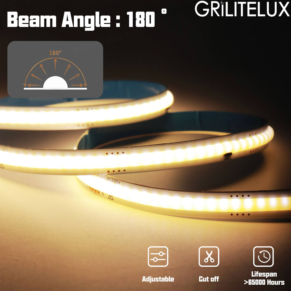 Bande lumineuse COB ultra-lumineuse alimentée par courant alternatif 110V 220V, super lumineuse, CRI90, ruban flexible COB, bande lumineuse LED