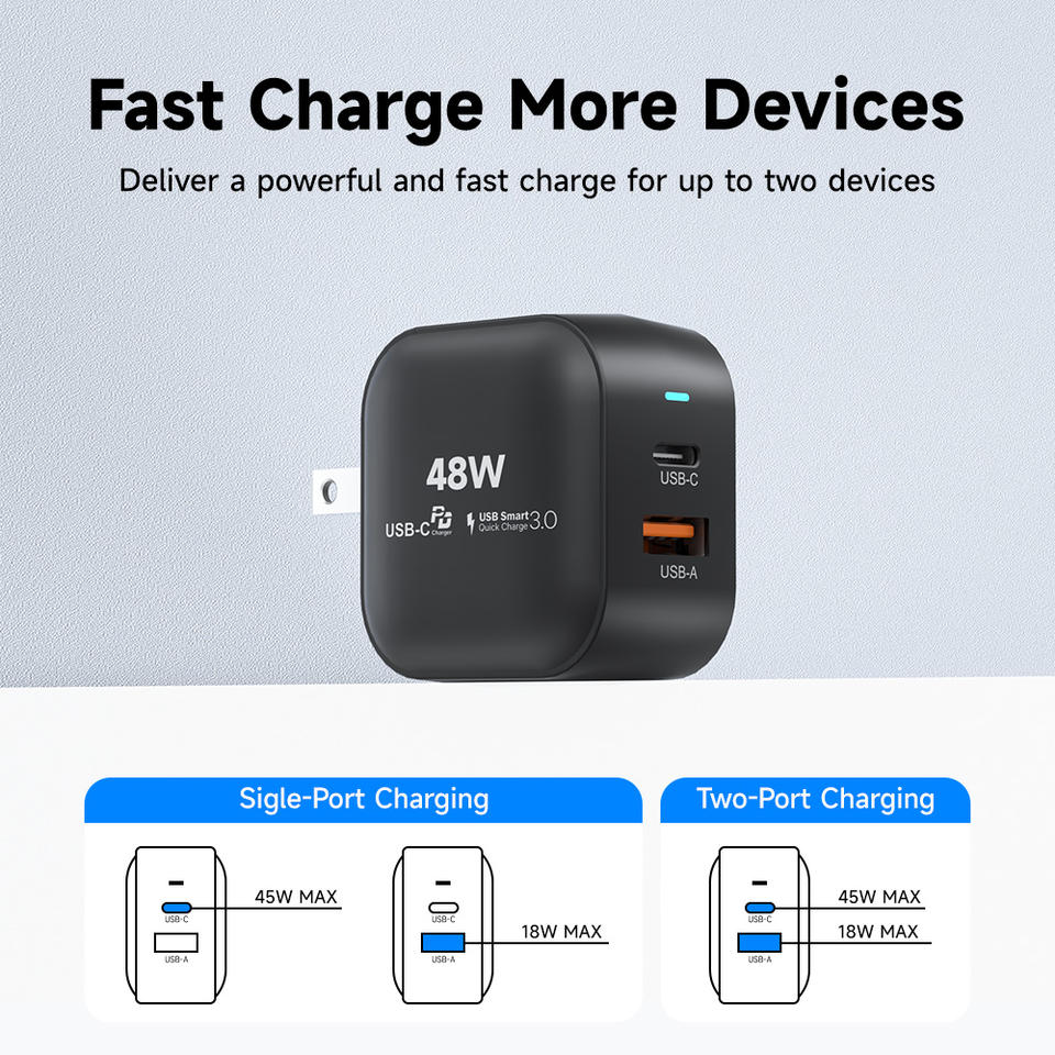 Chargeur GaN 48W ultra-haute performance avec prise en charge PPS et QC 3.0 pour une charge rapide des appareils USB-C et USB-A