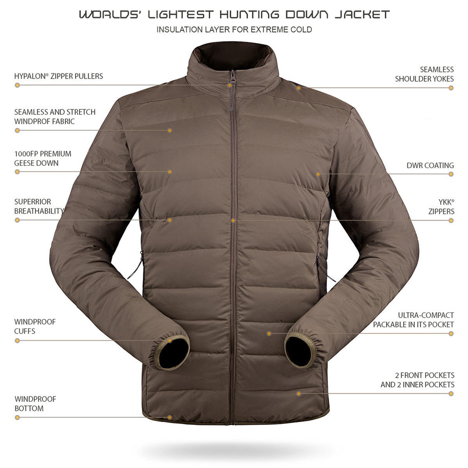 Veste de chasse ultra-légère en duvet d'oie, coupe-vent, extensible, pliable, isolée, pour l'hiver, veste tactique de chasse en plein air