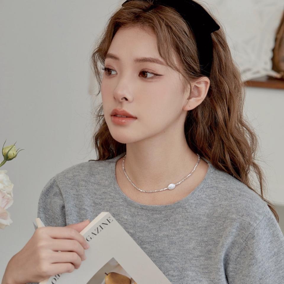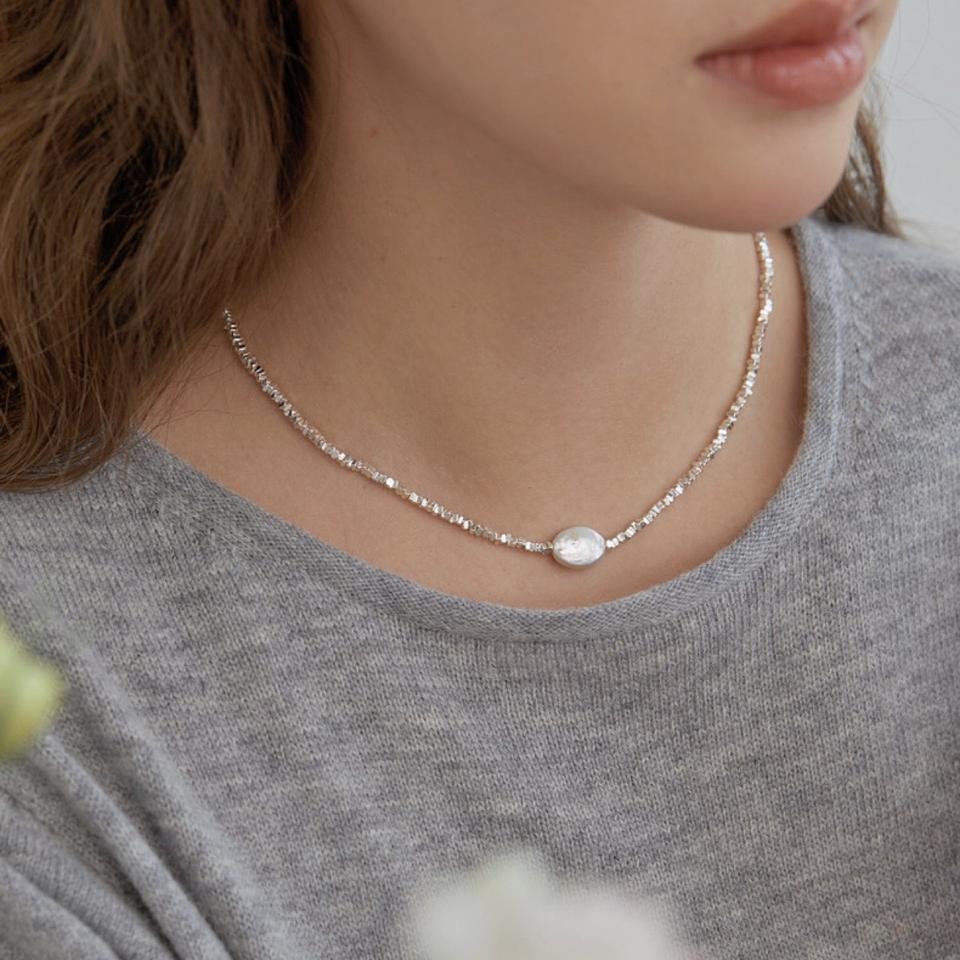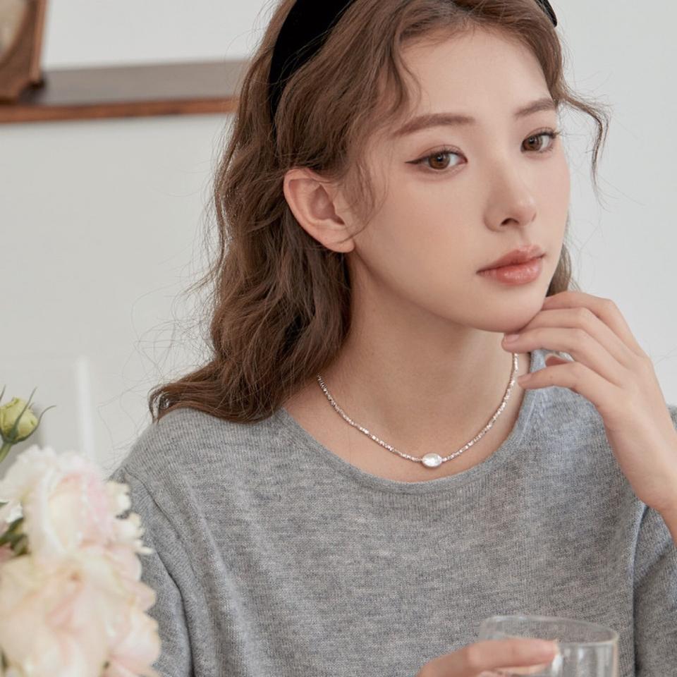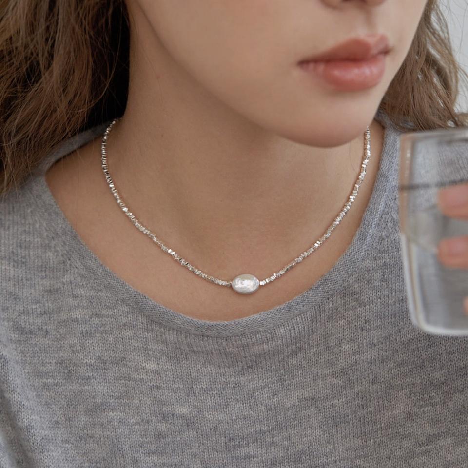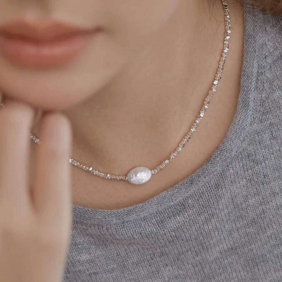 Collier ultra mini en argent massif 925 avec perle baroque, chaîne de clavicule carrée écrasée, bijoux de niche naturels