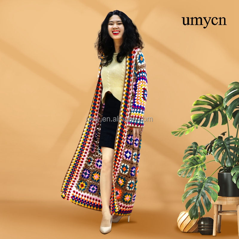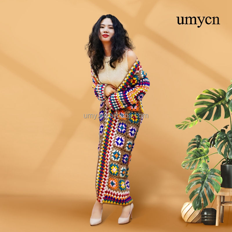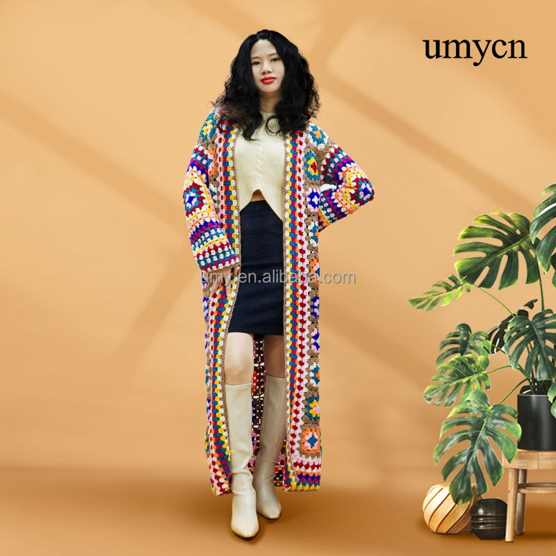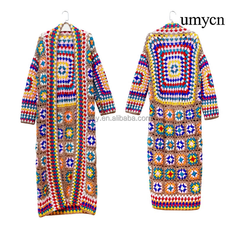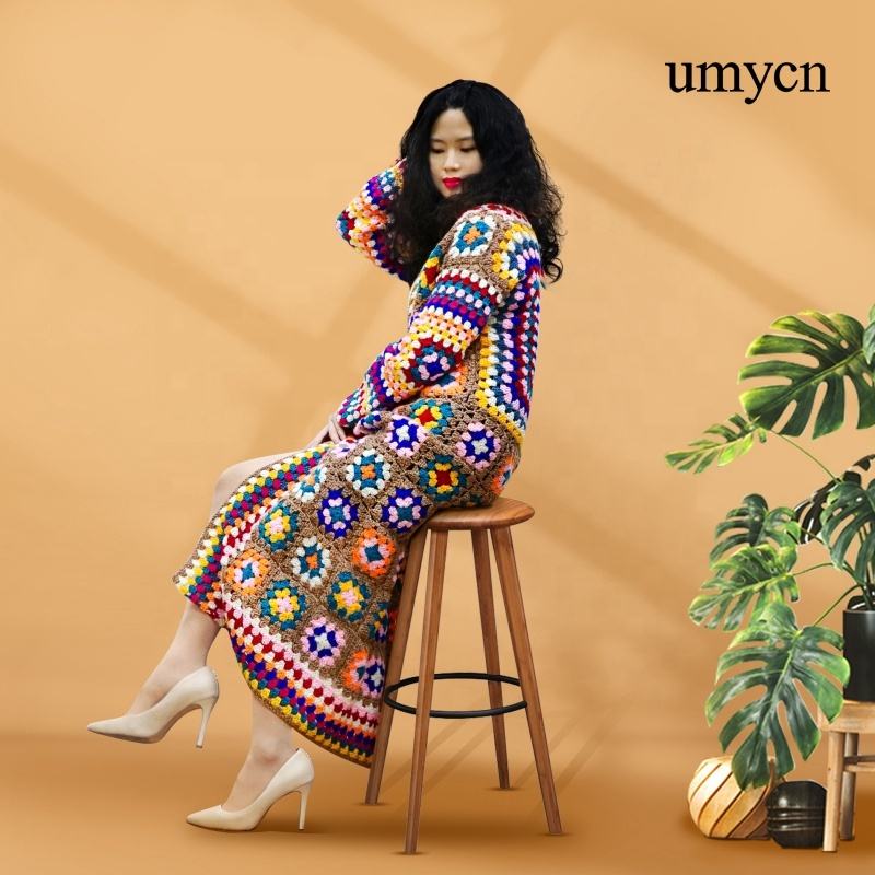 Umycn Boho fait à la main grand-mère carré longues dames Crochet vêtements tricot Patchwork manches Cardigan pull manteau pour les femmes