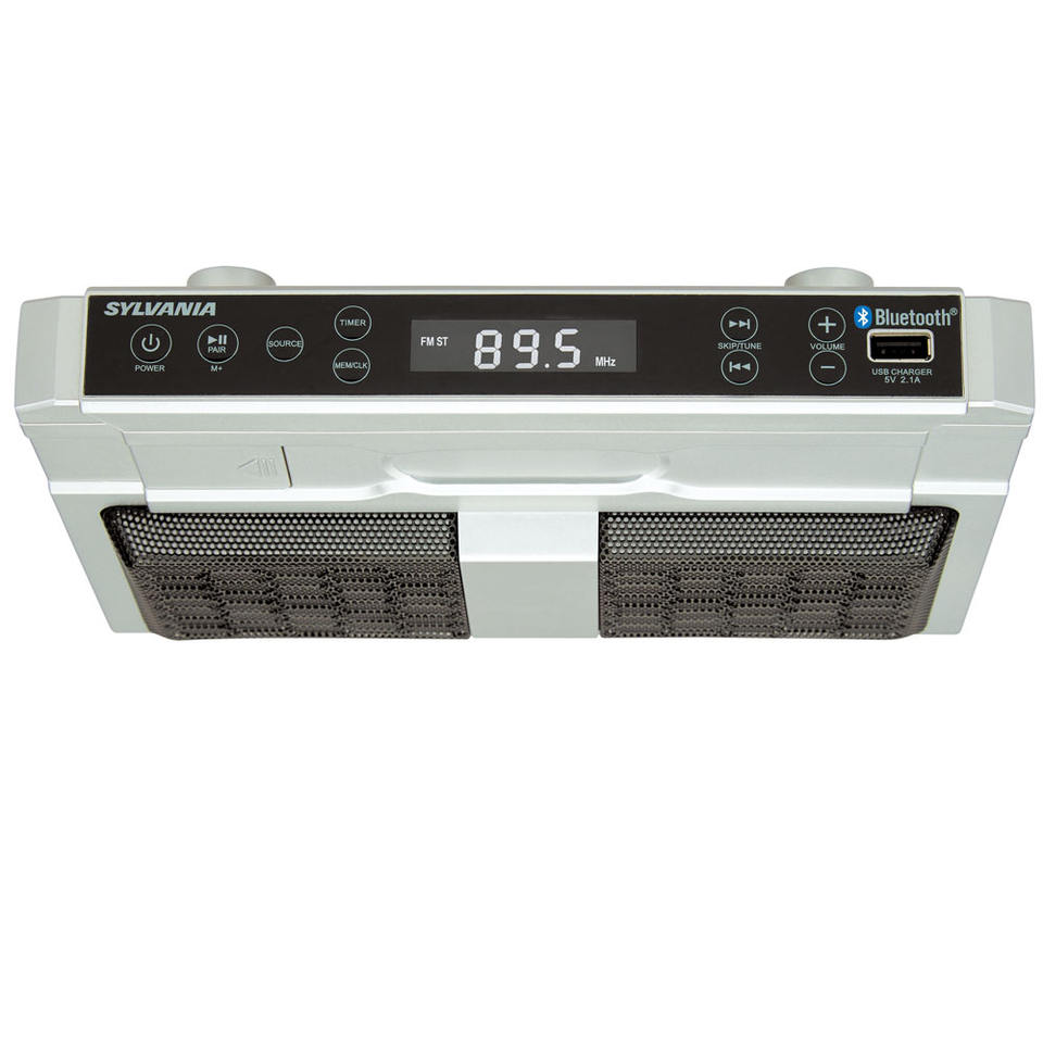 Radio FM Bluetooth sous l'armoire avec port de charge USB et minuterie de cuisson, haut-parleur 1W×2, adaptateur secteur, 11x9x4 pouces