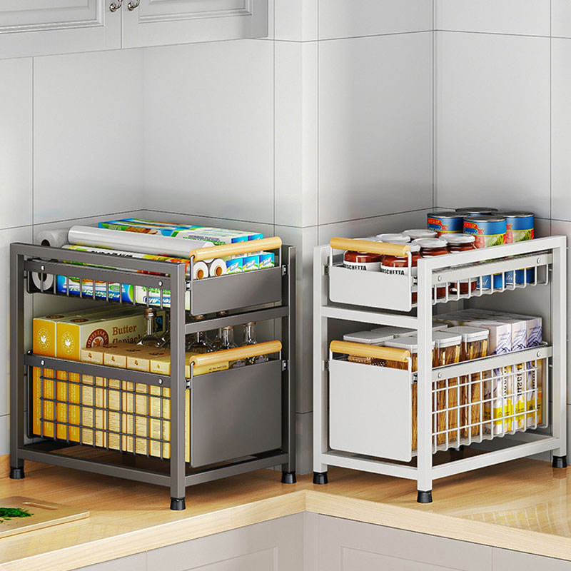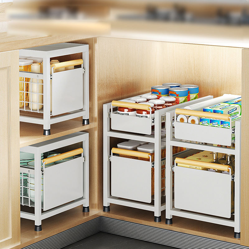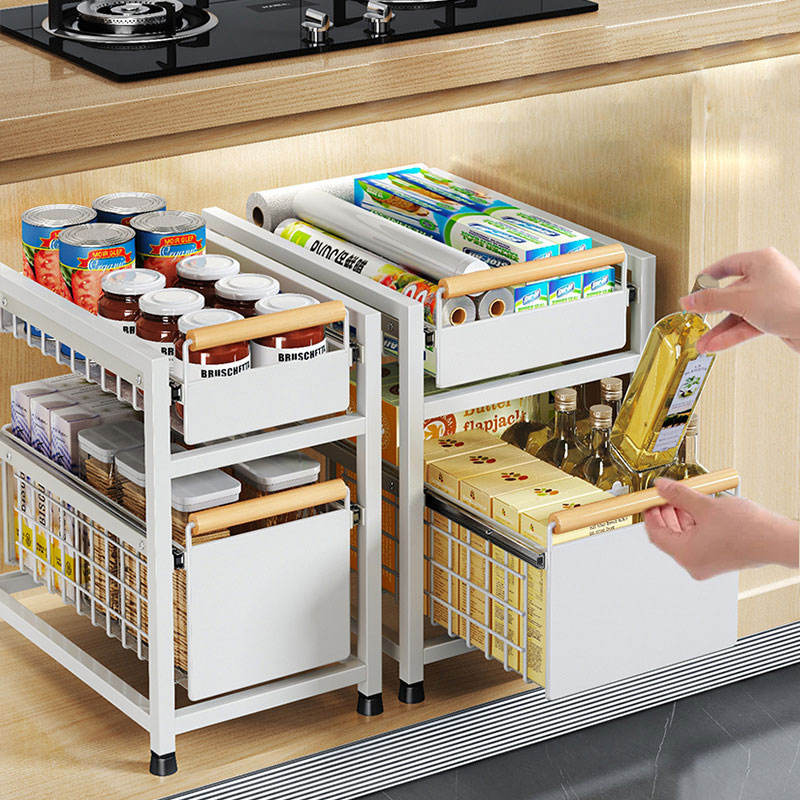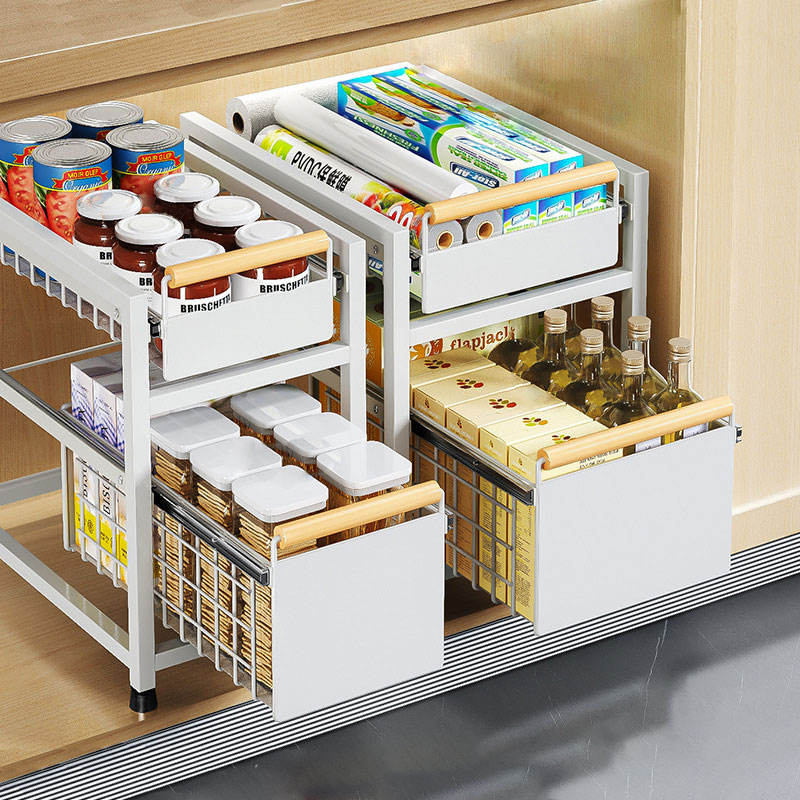 Organisateur d'armoire coulissant à 2 niveaux, tiroir pratique, panier de rangement polyvalent avec poignée pour cuisine, salle de bain