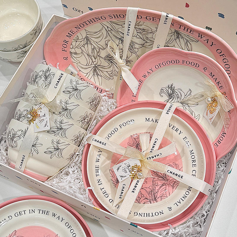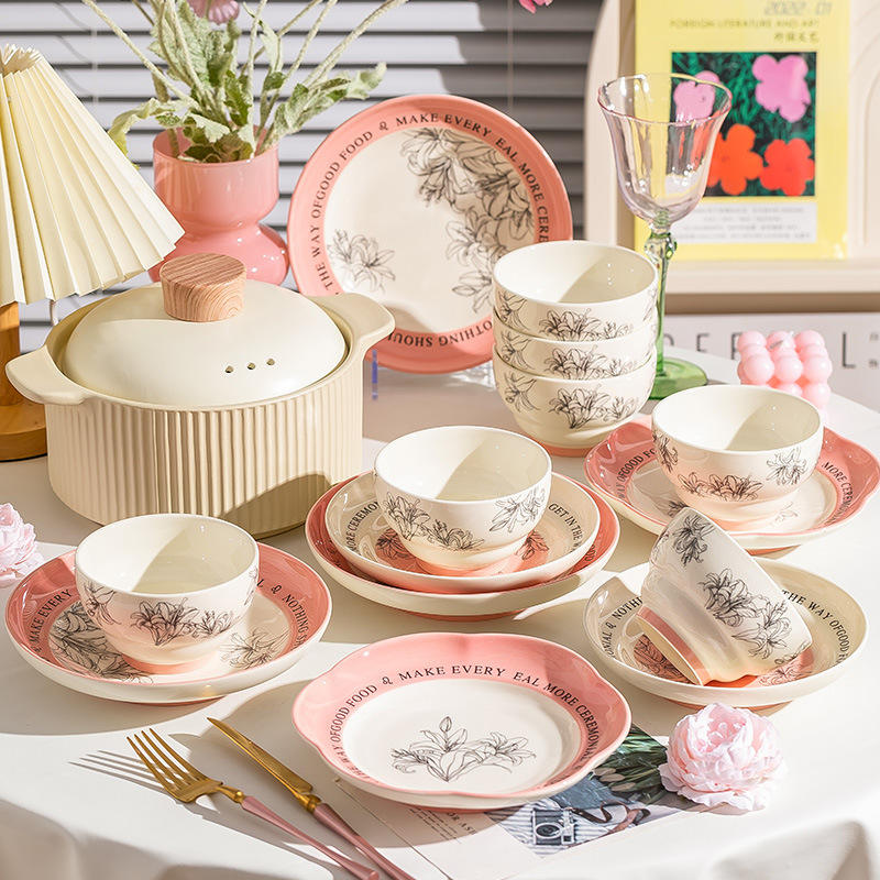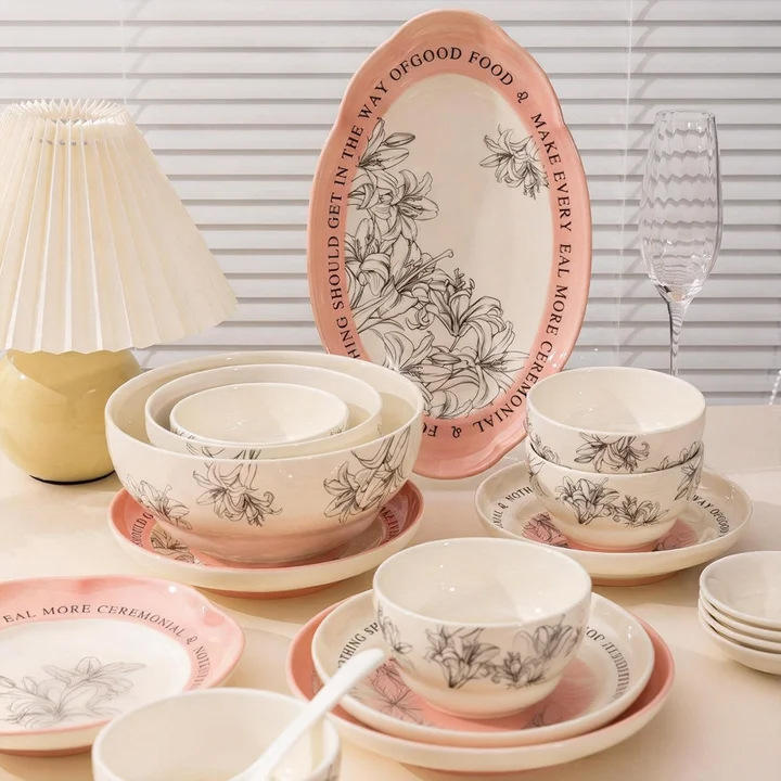 Ensemble de bols et assiettes en céramique à motif végétal sous glaçure, compatible micro-ondes, design créatif, vaisselle domestique