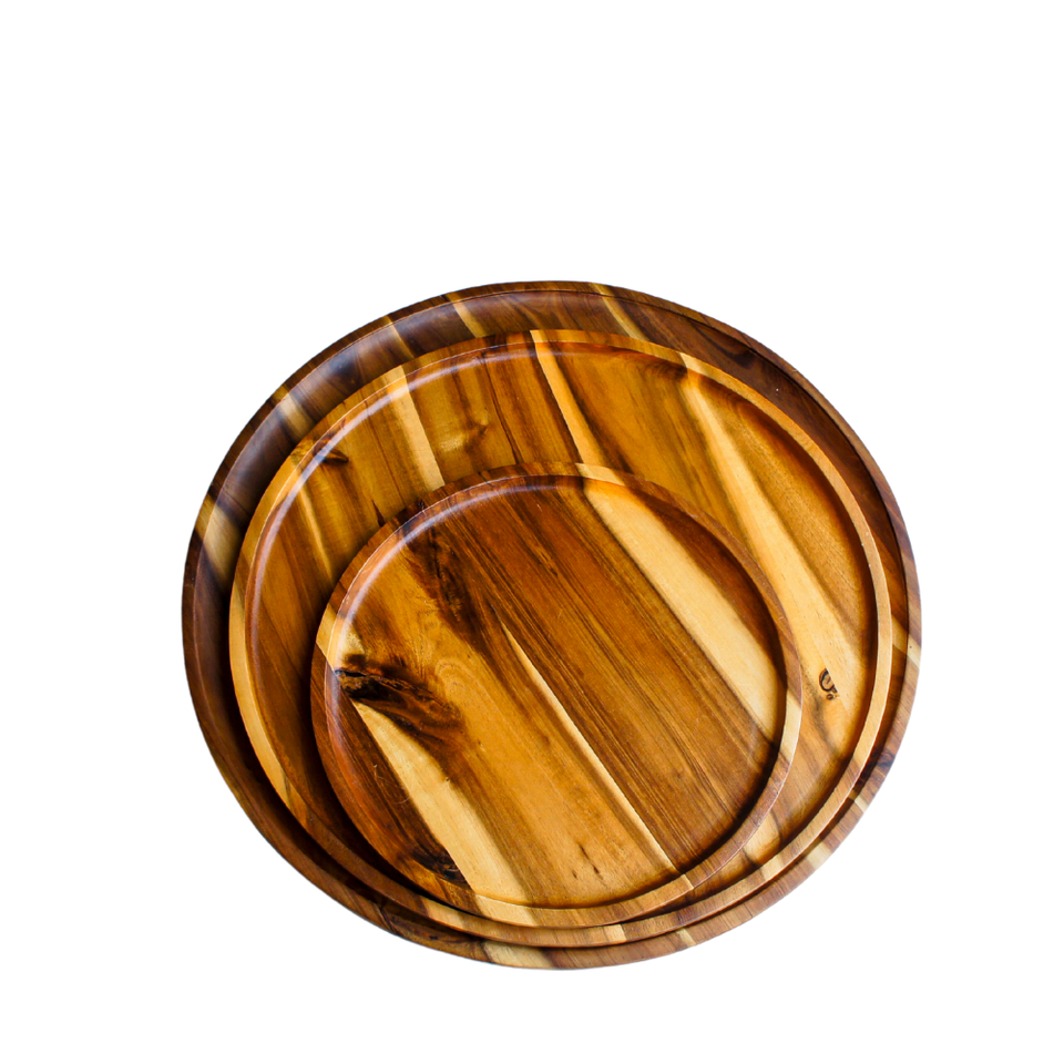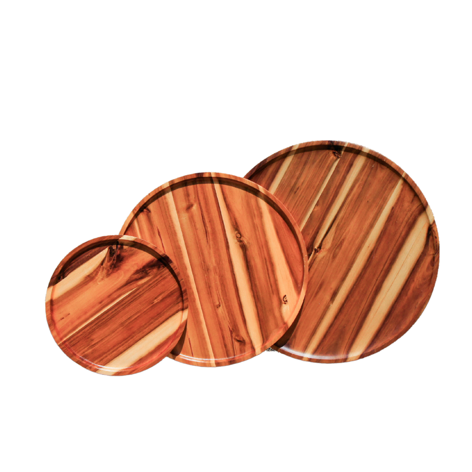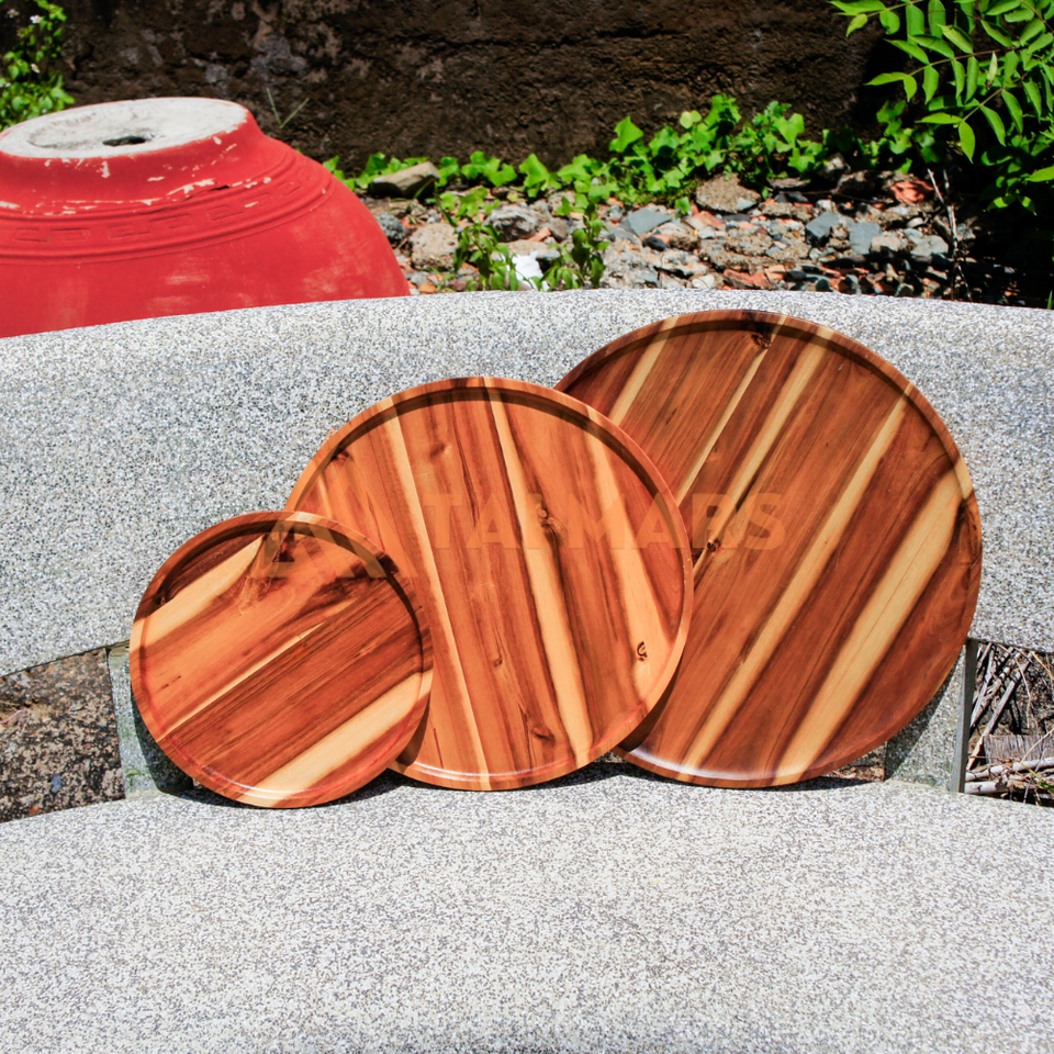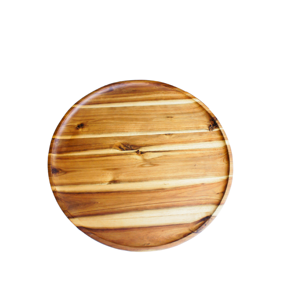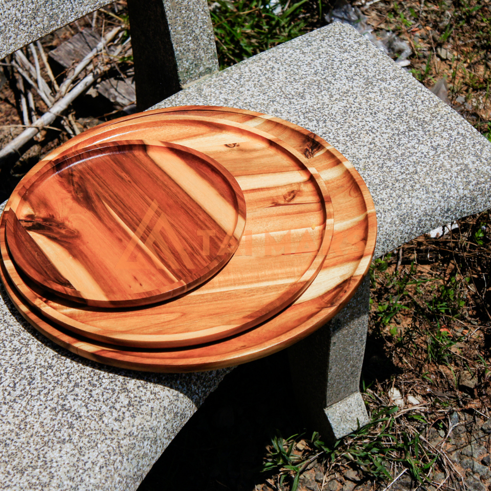 Inachevé 13-15 pouces grand mini plateau en bois d'acacia de service nouveaux designs plat et assiette en bois de forme ronde naturelle