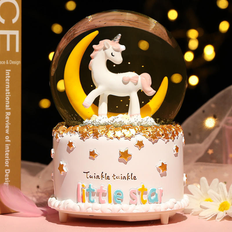 Licorne boîte aveugle boîte à musique pour cadeau boule de cristal lumineuse avec coeur flocon de neige résine boule à neige romantique décor à la maison