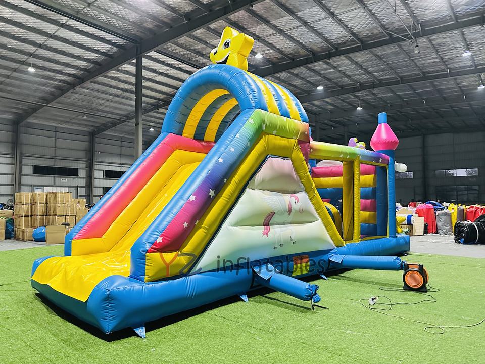 Château gonflable licorne avec toboggan, parcours d'obstacles gonflable licorne et mur d'escalade pour fête d'anniversaire d'enfants