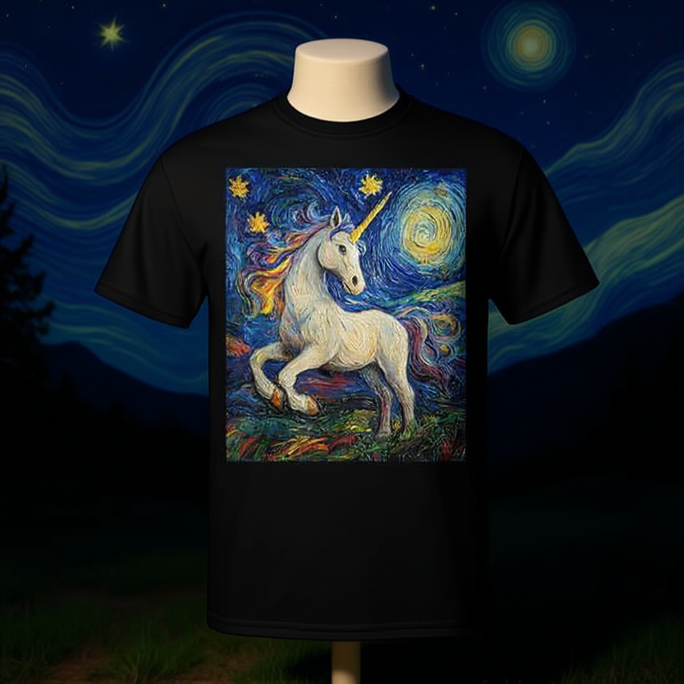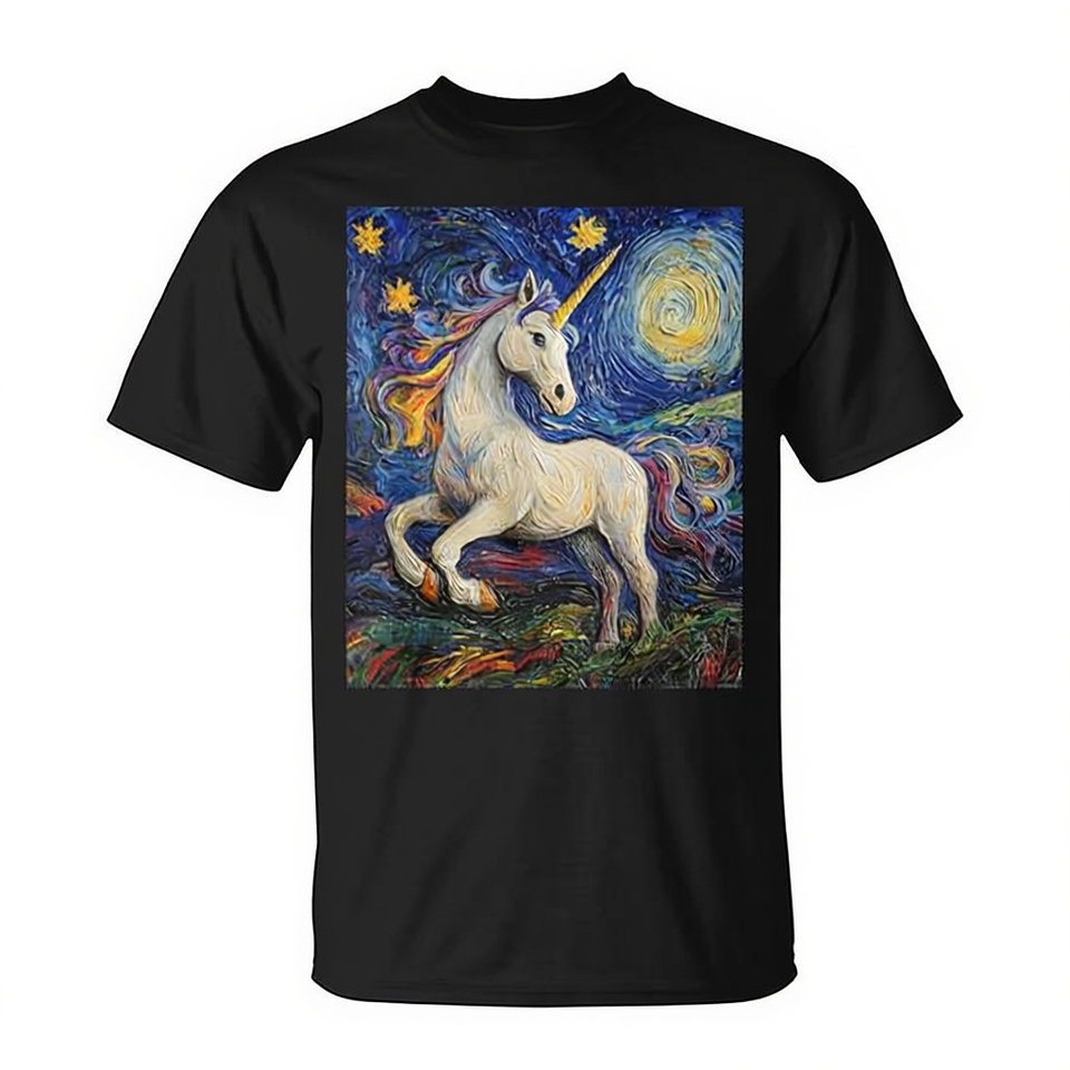 T-shirt Unicorne style Van Gogh Starry Night pour adulte unisexe noir