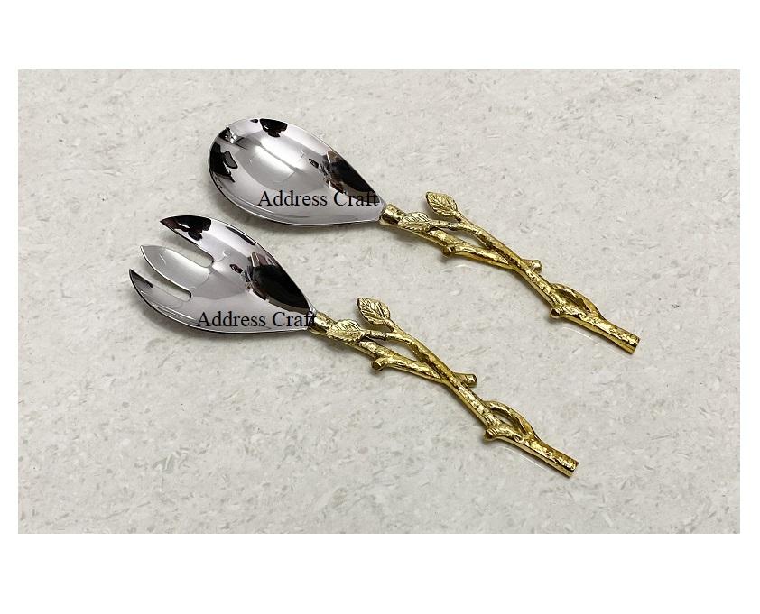 Ensemble de serveurs à salade en acier inoxydable avec poignée en laiton Design unique de feuille de branche Outils de cuisine Mains à salade pour la maison Hôtel Vaisselle Décor