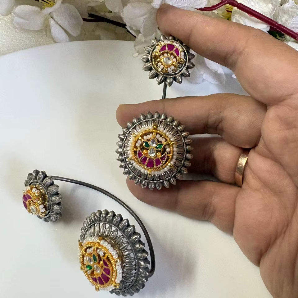 Boucles d'oreilles clous de style temple, design unique, plaqué argent et or, avec perles ou Kundan, pour mariée traditionnelle, disponibles à la vente