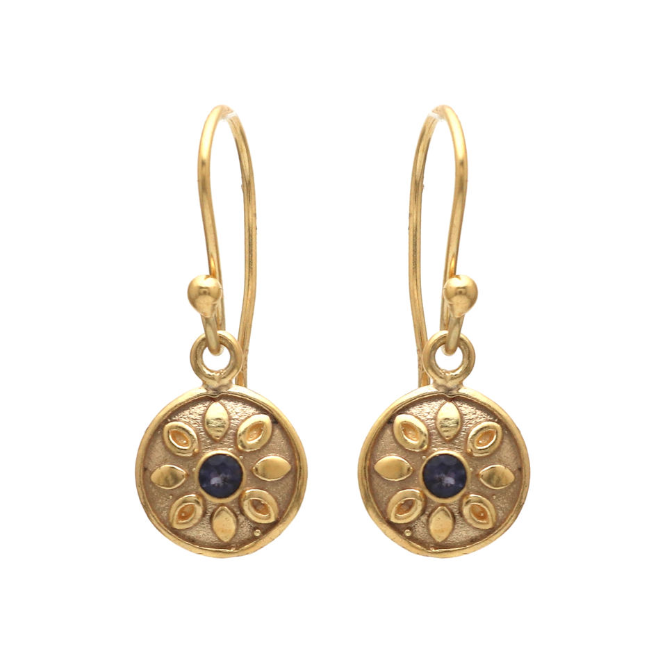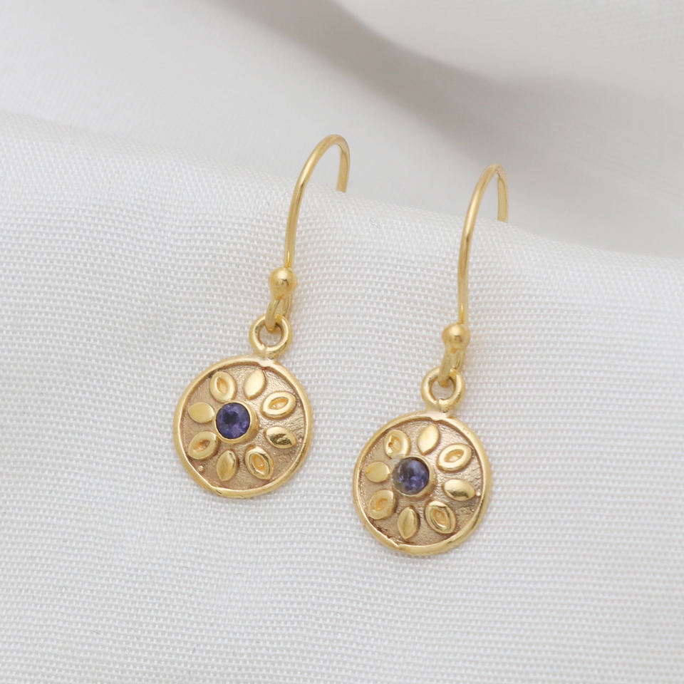 Boucles d'oreilles pendantes au design unique Pierre précieuse Iolite avec placage à l'or Fabriqué à partir d'argent sterling 925 Bijoux fins pour femmes