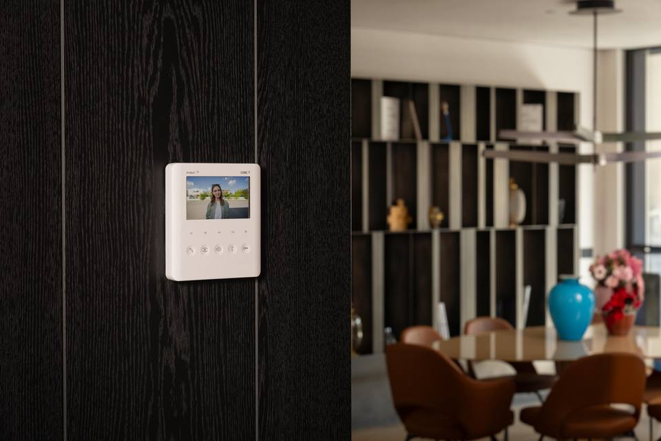 Kit de système d'entrée vidéo unifamilial, Composé de PLX V WIFI mains libres vidéo, Système d'entrée avec écran LCD 5 pouces, Et équipé de WIFI, Pour les appels à distance vers un smartphone avec une application dédiée, LHS V/01 PLUS panneau d'entrée pour montage mural, Avec un seul bouton d'appel, Unité d'alimentation VAS/101 et 5 étiquettes de proximité, Avec la technologie RFID 125 kHzSolution de projet Capacité
