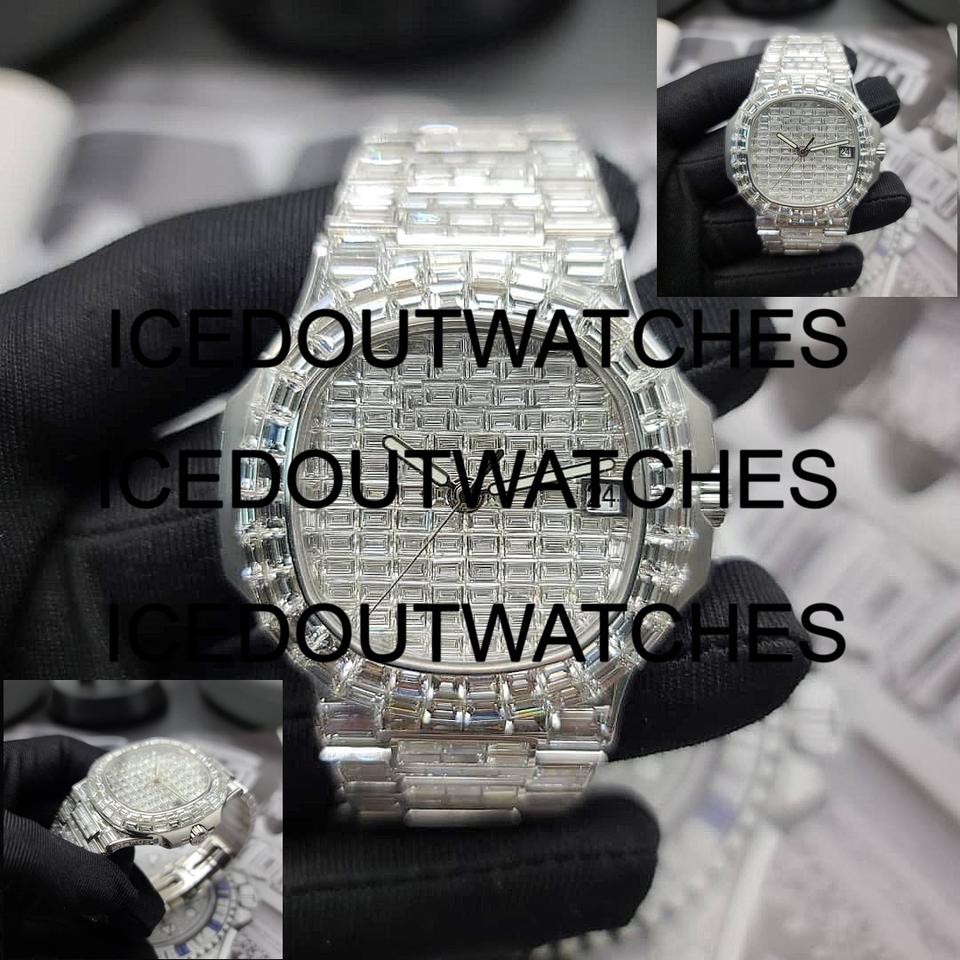 Montre à quartz pour homme en acier inoxydable avec cadran en verre, design unique hip-hop, finition brillante et sertie de pierres baguette, haute qualité