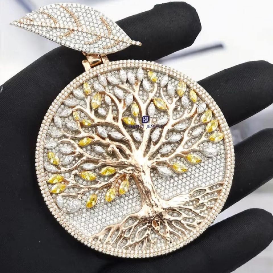 Pendentif Arbre de Vie au design unique, serti de pierres Moissanite VVS, plaqué or, collier Hip Hop pour hommes et femmes, en vente