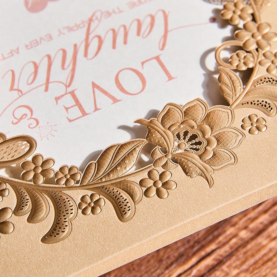 Invitation unique en or gaufré et doré, design floral en dentelle original avec enveloppes vierges et feuille d'insertion pour les boutiques de papeterie et de cadeaux
