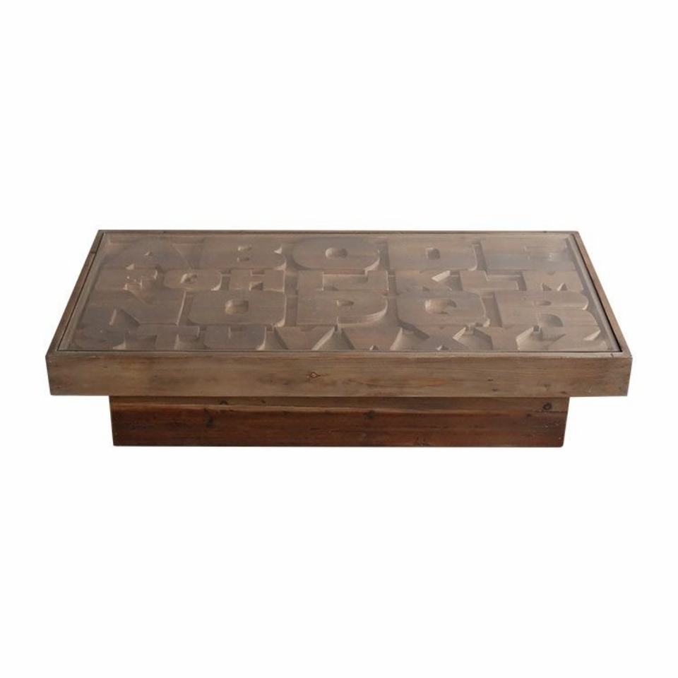 Nom du produit:Table basse alphabet, mobilier de maison, base en bois ancien, plateau en verre.