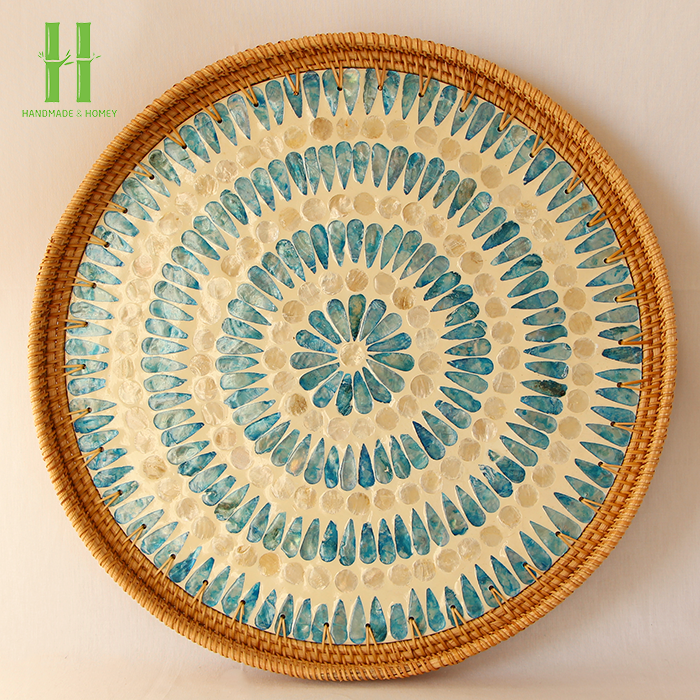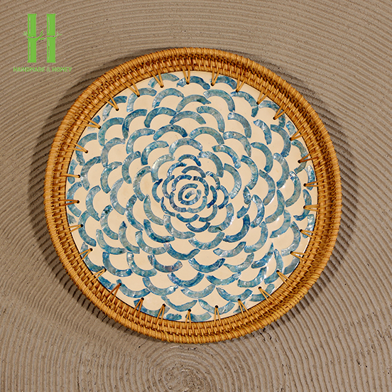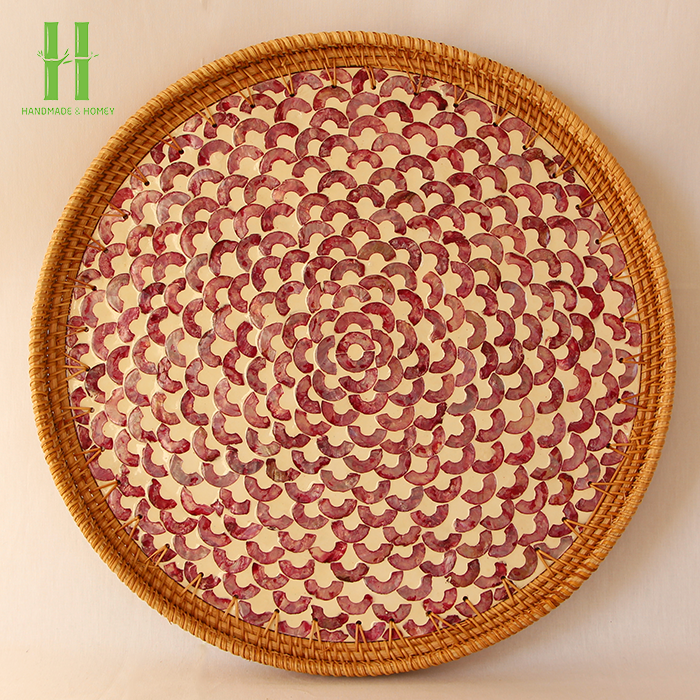 Plateau de service rustique bohème en bambou au design unique, motif nacre, rotin, nacre 5 mm d'épaisseur, écologique, 350 mm