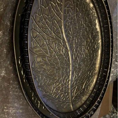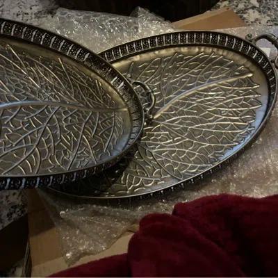 Ensemble de plateaux ovales en métal uniques avec motif d'arbre à l'intérieur et poignées festonnées, idéal pour paniers-cadeaux et service d'accueil.