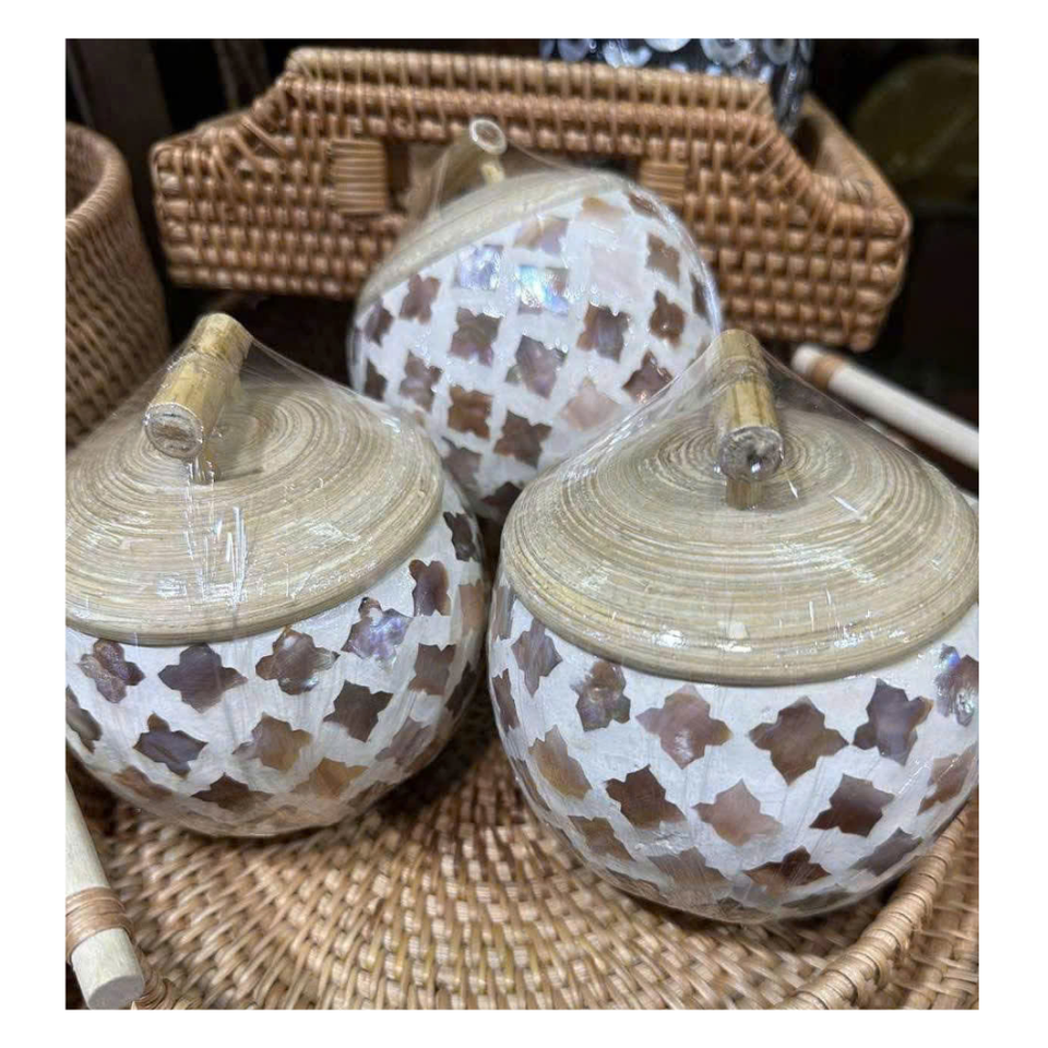 Boîte en bambou unique avec motif à pois, incrustée de nacre, petit pot décoratif pour aliments secs et bijoux, décoration festive vibrante