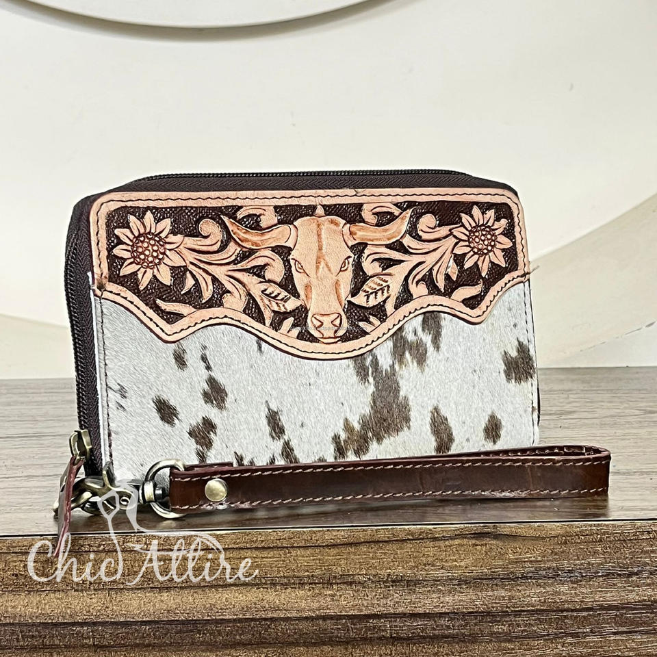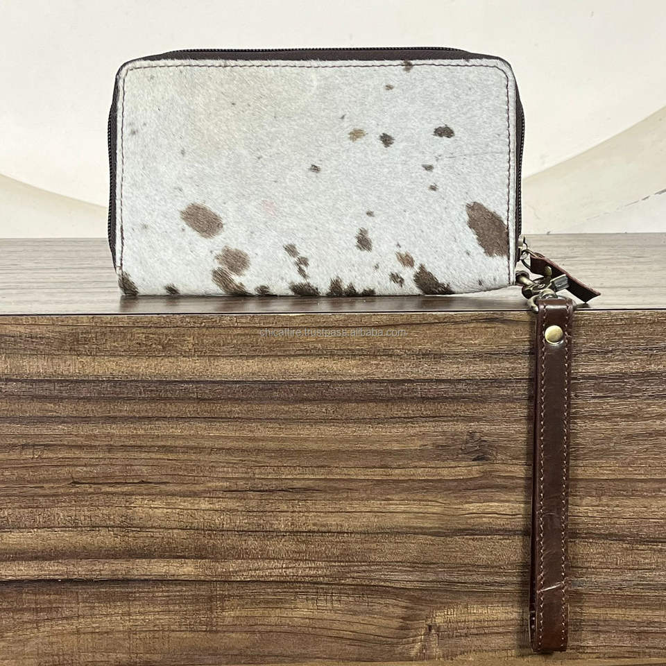 Pochette unique en cuir de vachette véritable, artisanale et haut de gamme, avec motif floral gravé, fermeture éclair, portefeuille élégant pour femmes