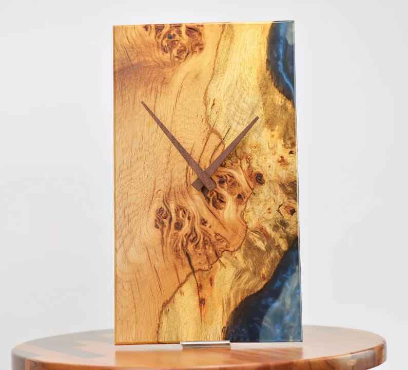 Horloge de bureau rectangulaire unique en bois de burl avec résine époxy bleue, bord brut, silencieuse, pour décoration de bureau de luxe