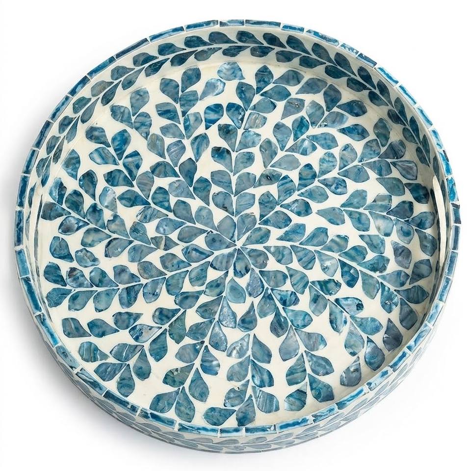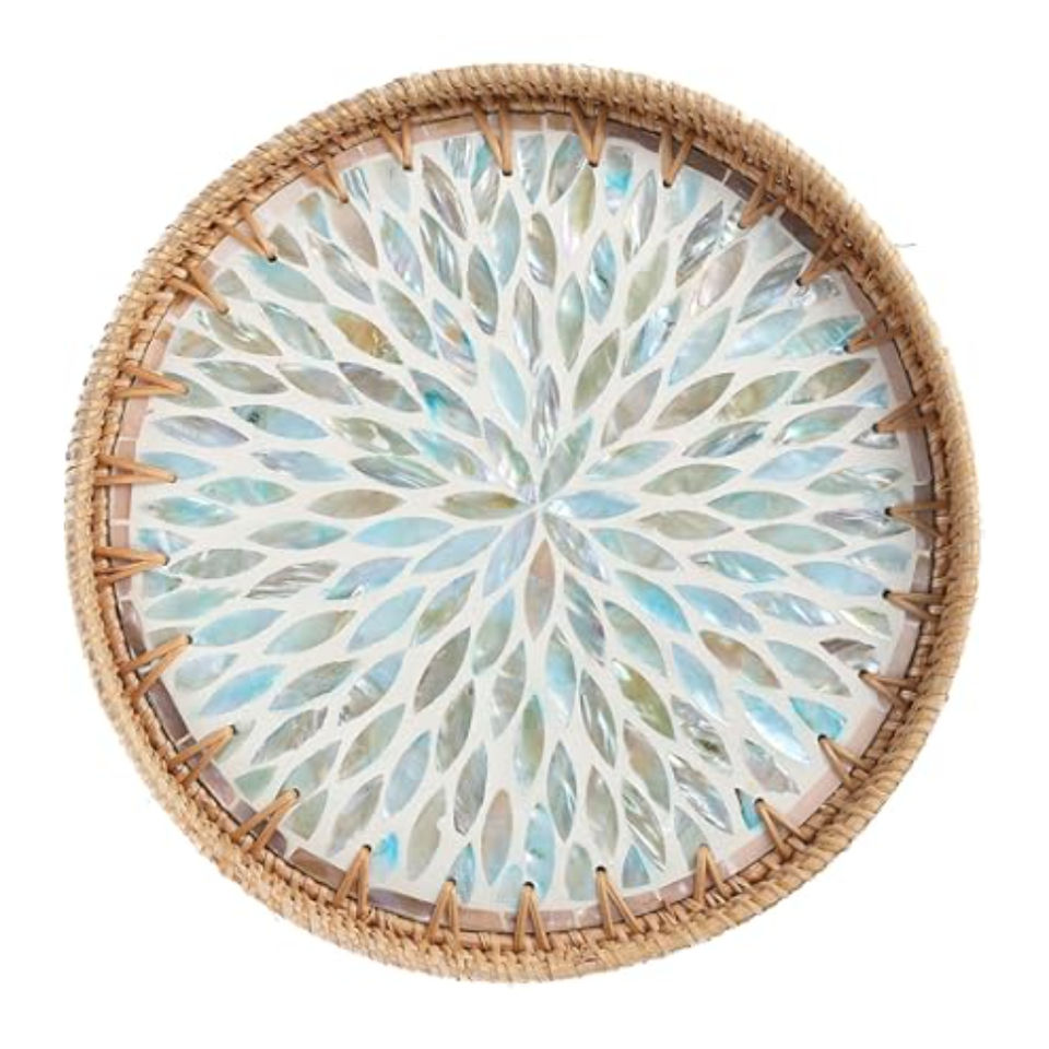 Plateau de service rond unique en rotin avec incrustation de nacre, plateau décoratif en osier pour table basse, plateau ottoman en matériau naturel