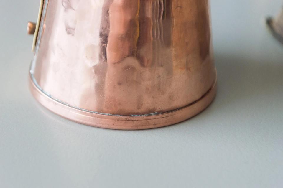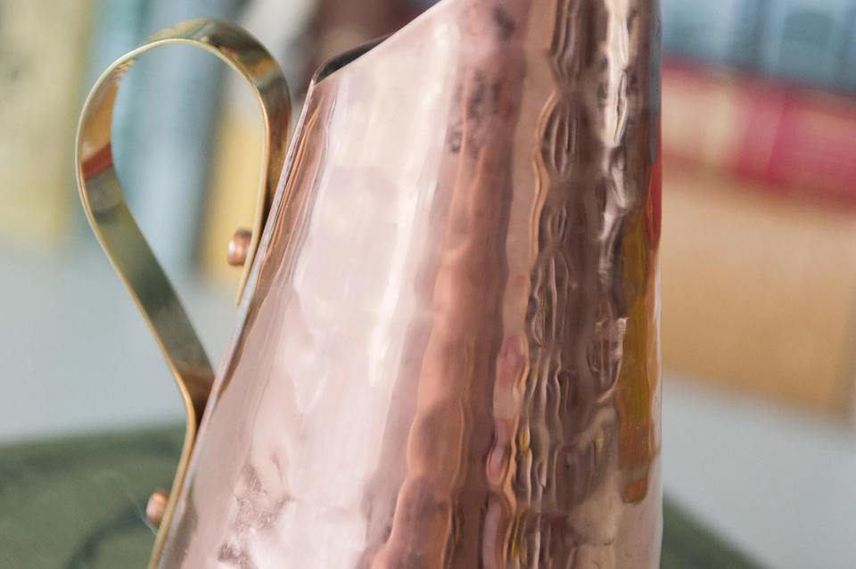 Carafe en cuivre de petite taille au design unique avec poignée courbée, idéale pour les repas en espace restreint et le service individuel, vente en gros depuis l'Inde