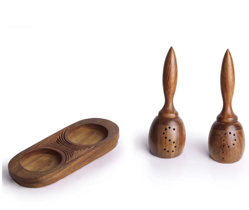Ensemble d'épices en bois de teck unique avec plateau incliné pour sel et poivre, support pour sel, poivre et moutarde en teck